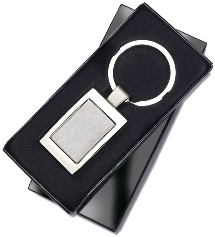 Luxusní kovový přívěsek na klíče obdélníkového tvaru. Baleno v černé dárkové krabičce.