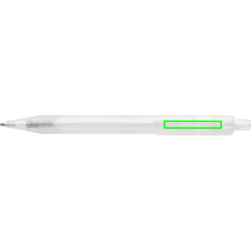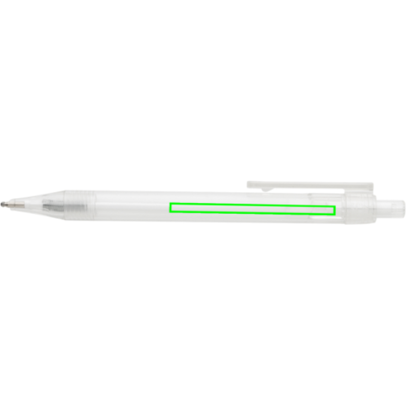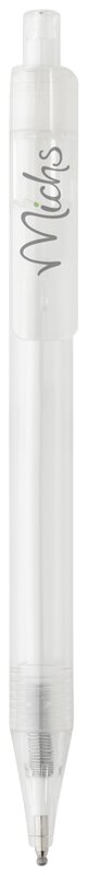 Moderní kuličkové pero s průhledným vzhledem, které obsahuje náplň s modrým inkoustem. Produkt je vyroben z GRS recyklovaného PET plastu. Celkový podíl recyklátu dle váhy produktu: 84 %.