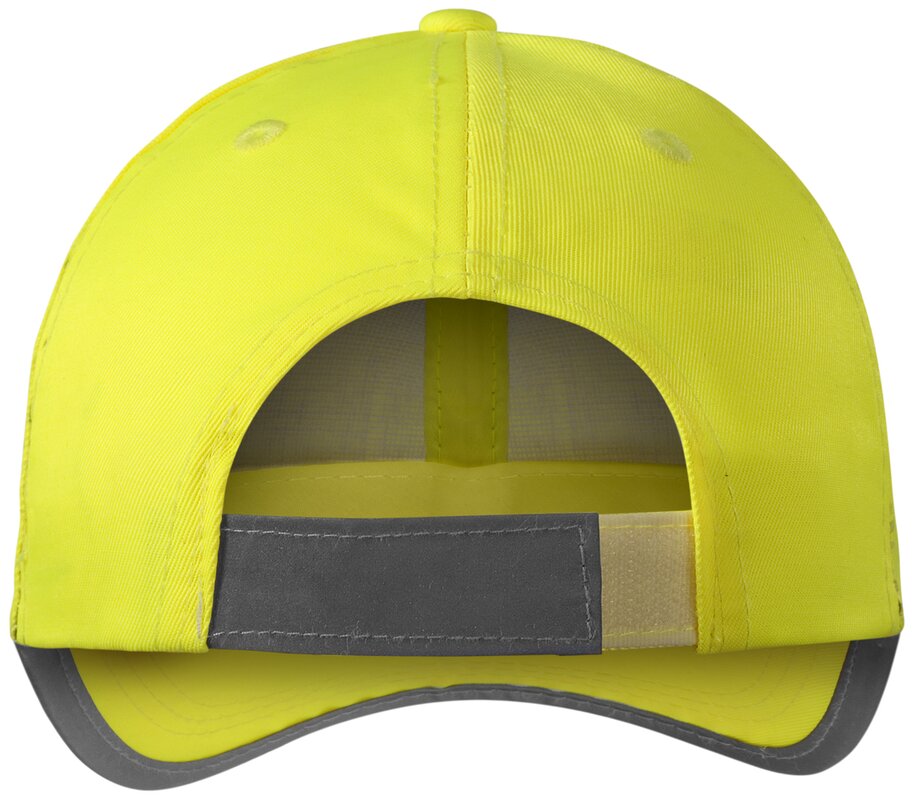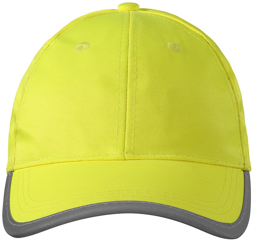 Šestipanelová čepice z fluorescenčního materiálu. Retroreflexní lem na kšiltu. Velikost nastavitelná suchým zipem s našitou retroreflexní páskou. Obšívané větrací otvory.