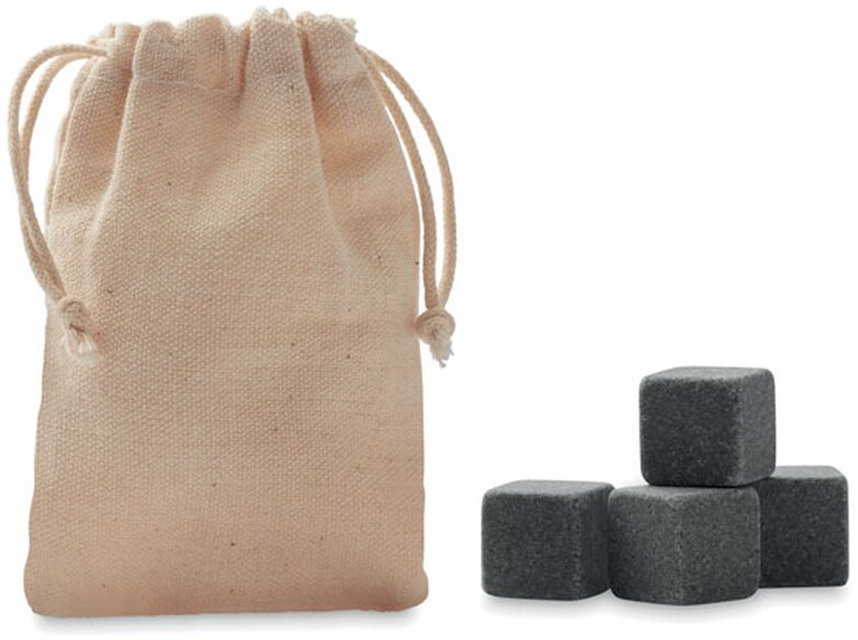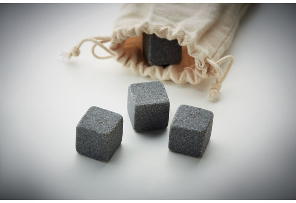 Sada 4 opakovaně použitelných kostek z kamene v praktickém úložném sáčku z bavlny.
