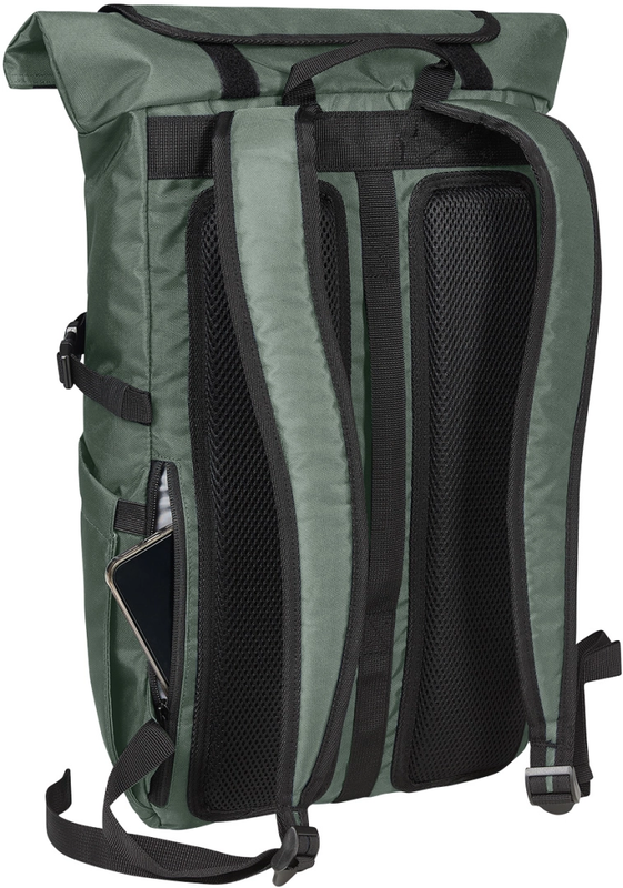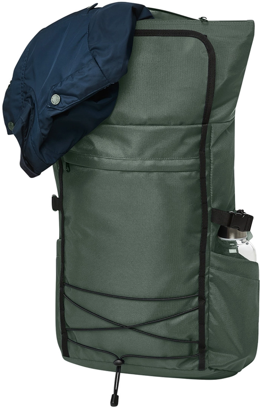 Všestranný batoh s inovativním zvětšením objemu, vnější materiál rPET, prostorná hlavní přihrádka na zip, plochá zasouvací přihrádka uvnitř, velká přední kapsa na zip, funkční poutko s elastickou šňůrkou, dvě boční zasouvací přihrádky např. na lahve s pitím, upevňovací popruhy, zadní samostatně přístupná přihrádka na notebook s velurovou podšívkou, polstrovaný nosný systém, skrytá zadní kapsa na zip, polstrované dno, držadla na zadní straně použitelná také jako poutka pro upevnění na tyčoví kufru, držadlo na přenášení