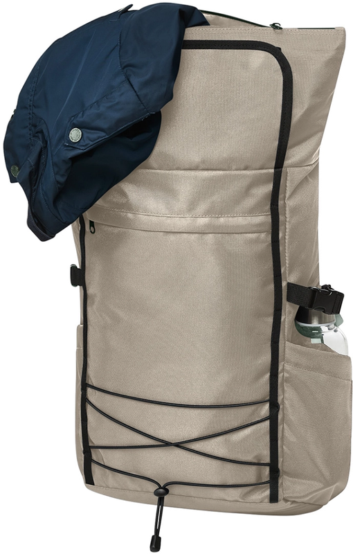 Všestranný batoh s inovativním zvětšením objemu, vnější materiál rPET, prostorná hlavní přihrádka na zip, plochá zasouvací přihrádka uvnitř, velká přední kapsa na zip, funkční poutko s elastickou šňůrkou, dvě boční zasouvací přihrádky např. na lahve s pitím, upevňovací popruhy, zadní samostatně přístupná přihrádka na notebook s velurovou podšívkou, polstrovaný nosný systém, skrytá zadní kapsa na zip, polstrované dno, držadla na zadní straně použitelná také jako poutka pro upevnění na tyčoví kufru, držadlo na přenášení