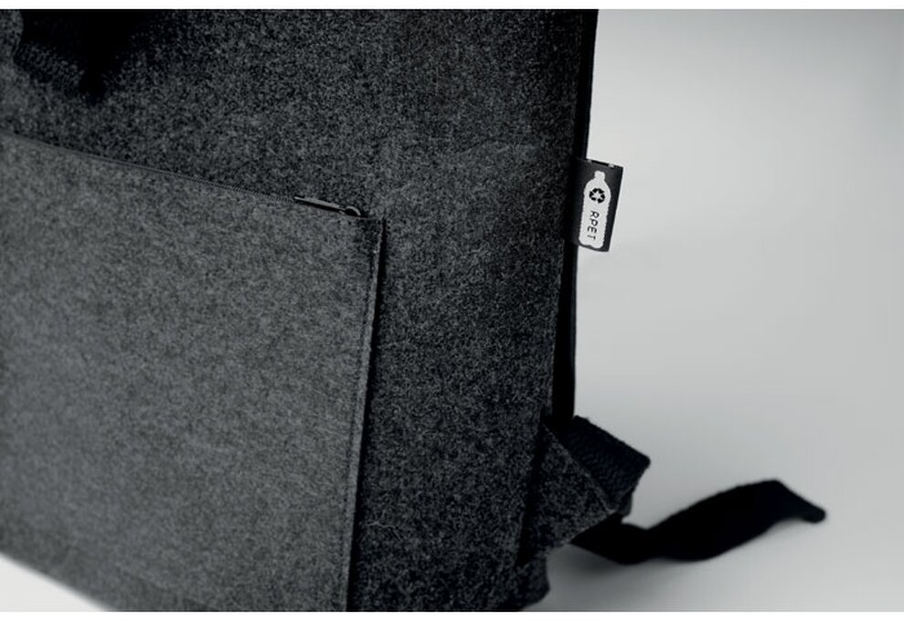 Batoh z plsti RPET s bavlněným zavíracím popruhem a kapsou na zip na přední straně. Včetně přihrádky na notebook.