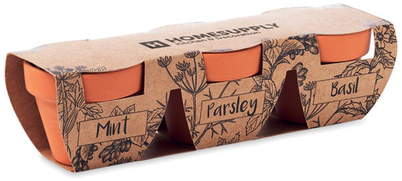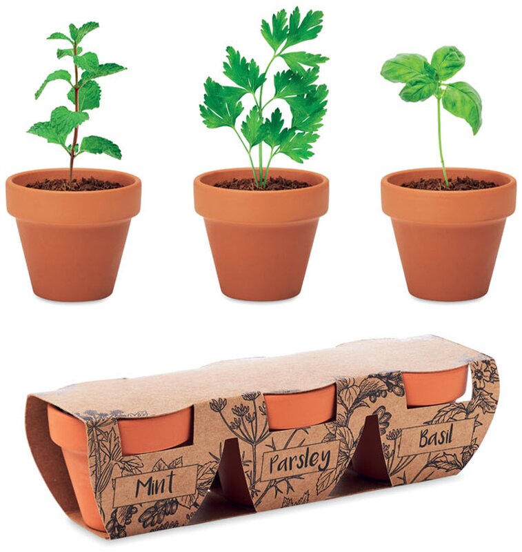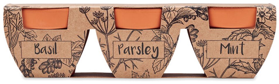 Sada 3 hliněných květináčů se semeny různých bylin: máta, petržel a bazalka.