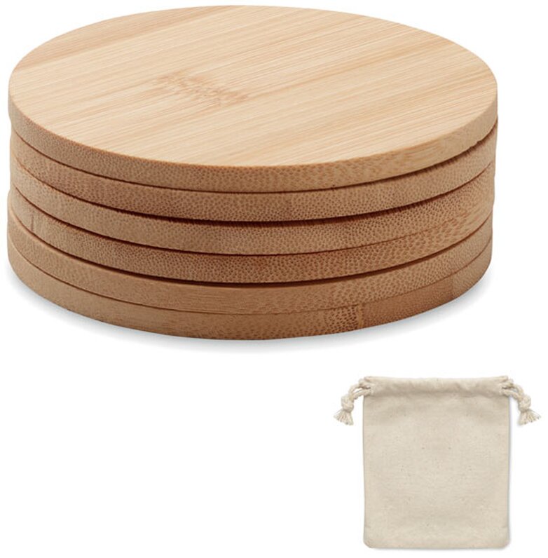 Sada bambusových podtácků BAYIN SET v bavlněném sáčku se stahovací šňůrkou. Obsahuje 6 ks.