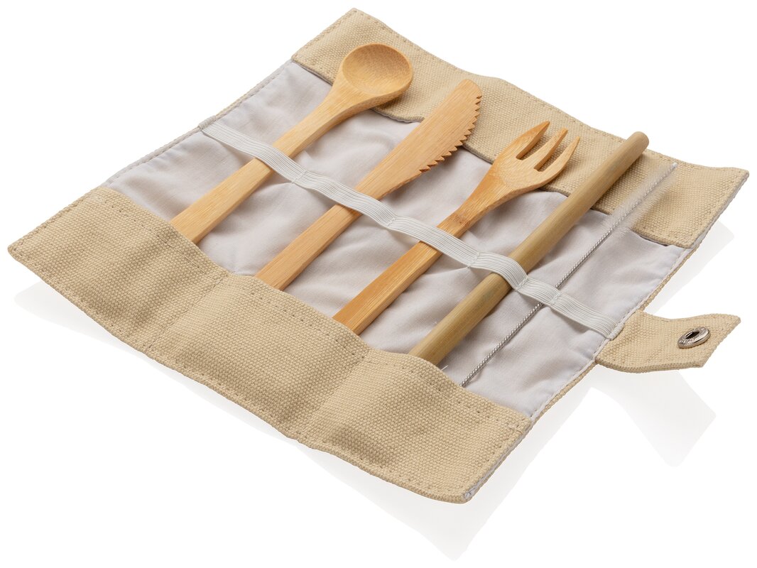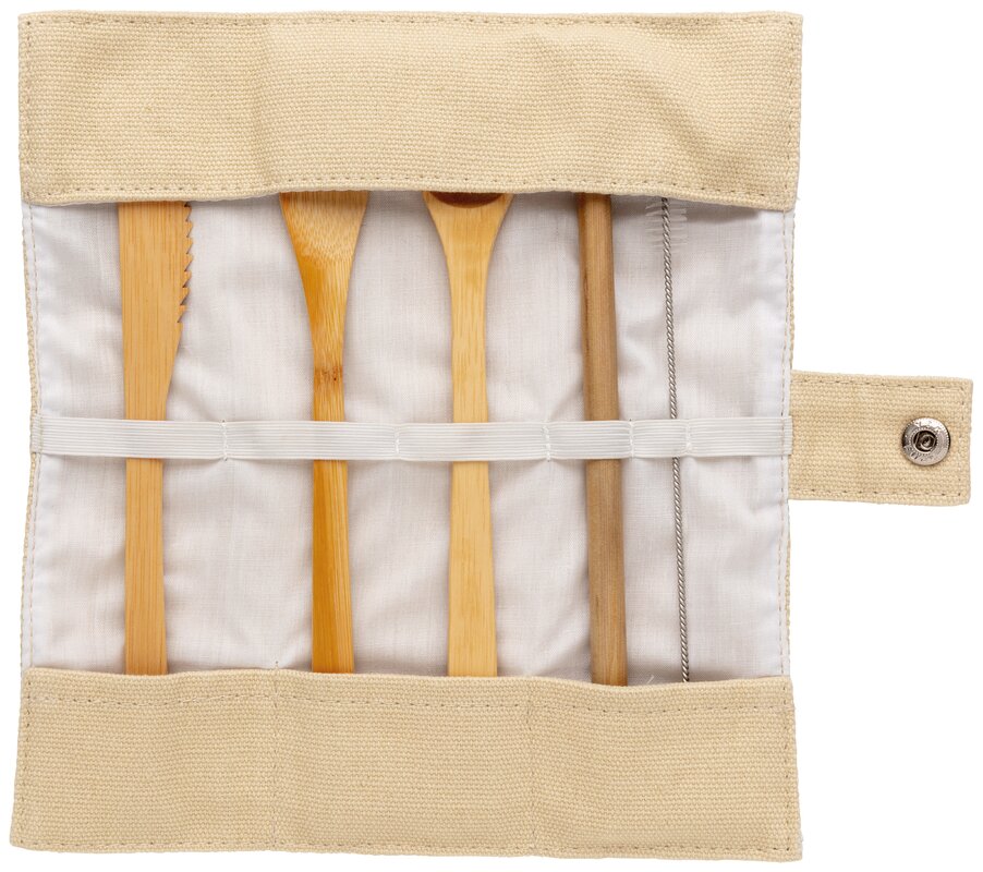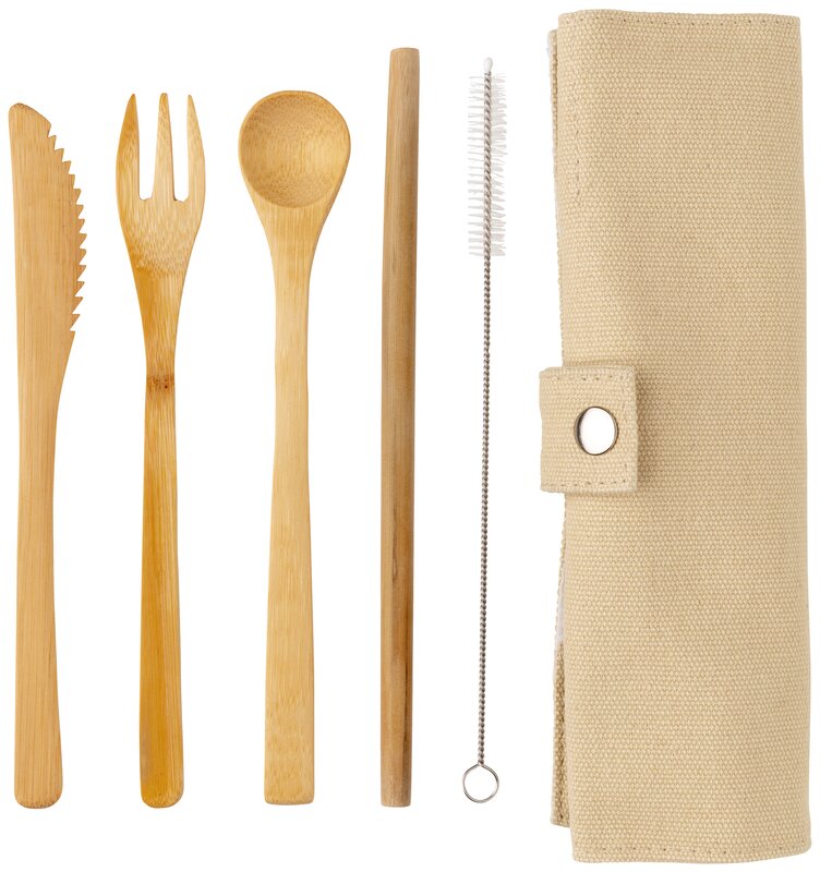 Praktická ekologická sada příborů pro opakované použití, která skvěle nahrazuje plastové varianty. Set zahrnuje lžičku, vidličku, nůž, brčko a štětečku na čištění. Vše je baleno v pěkné canvas sáčku.