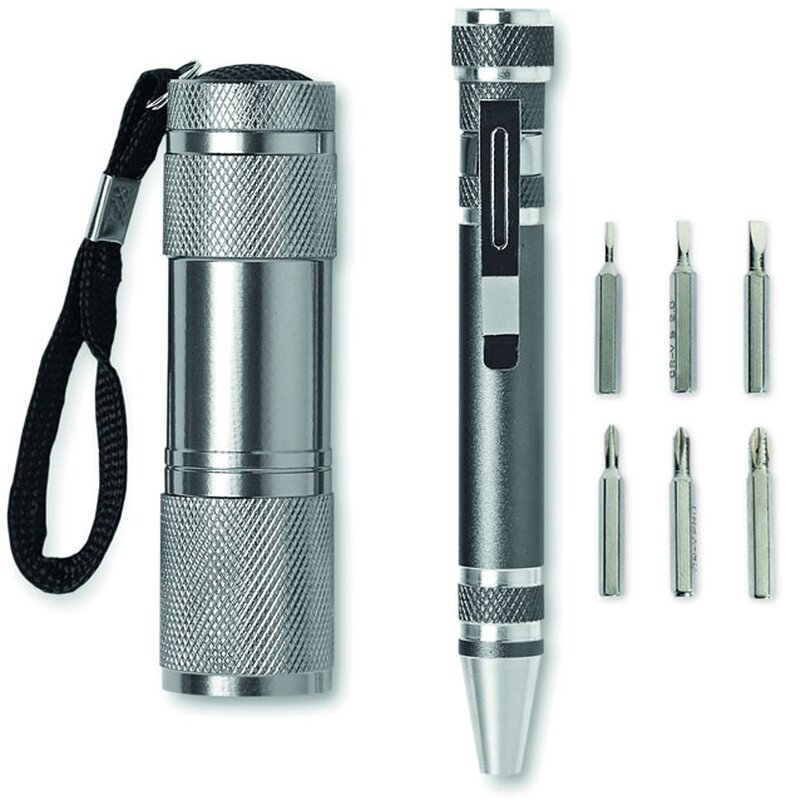 Sada nářadí s 9 LED hliníkovou baterkou a hliníkovým multifunkčním nástrojem ve tvaru pera. Obsahuje 3 štěrbinové a 3 křížové šroubováky. 3 AAA baterie nejsou v ceně. Baleno v krabici.
