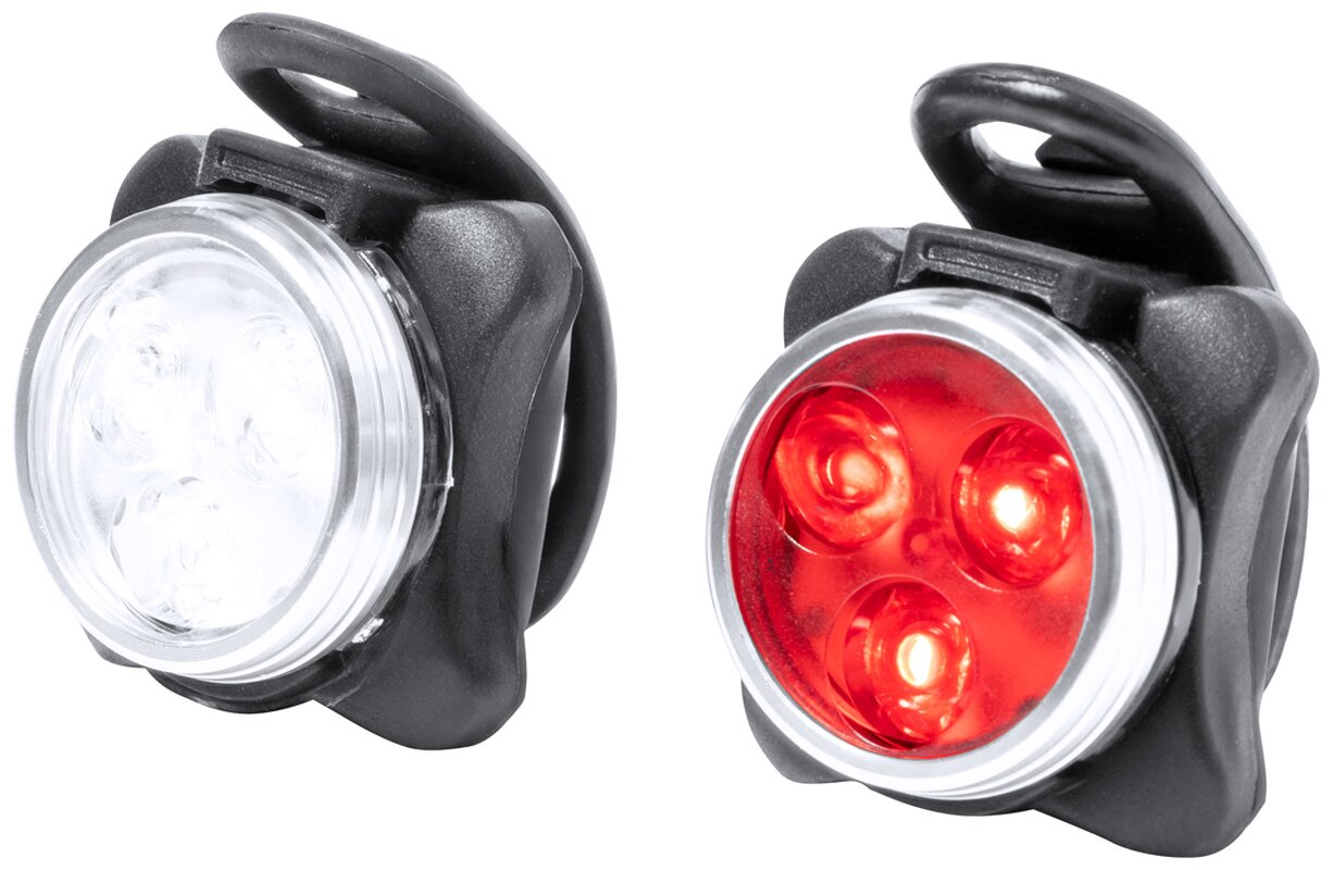 Praktická sada cyklistických světel s výkonnými 3 LED diodami v předním světle a 3 LED diodami v zadním blikajícím světle. Poskytují lepší viditelnost a bezpečnost při jízdě za snížené viditelnosti.