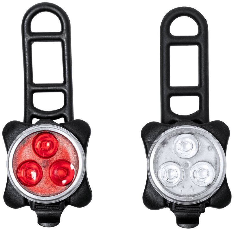 Praktická sada cyklistických světel s výkonnými 3 LED diodami v předním světle a 3 LED diodami v zadním blikajícím světle. Poskytují lepší viditelnost a bezpečnost při jízdě za snížené viditelnosti.