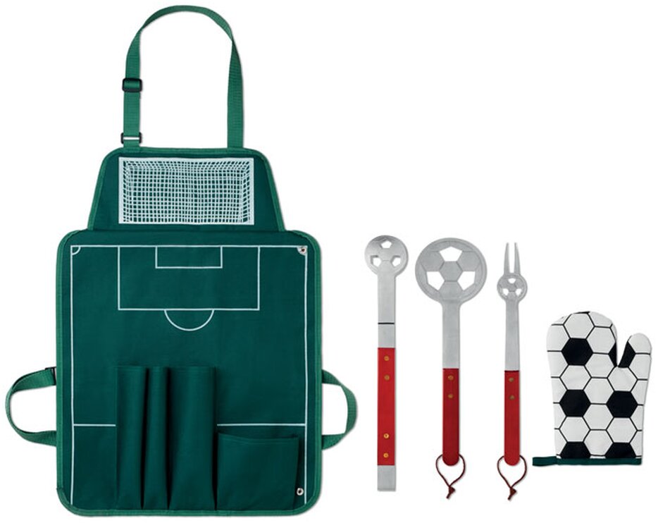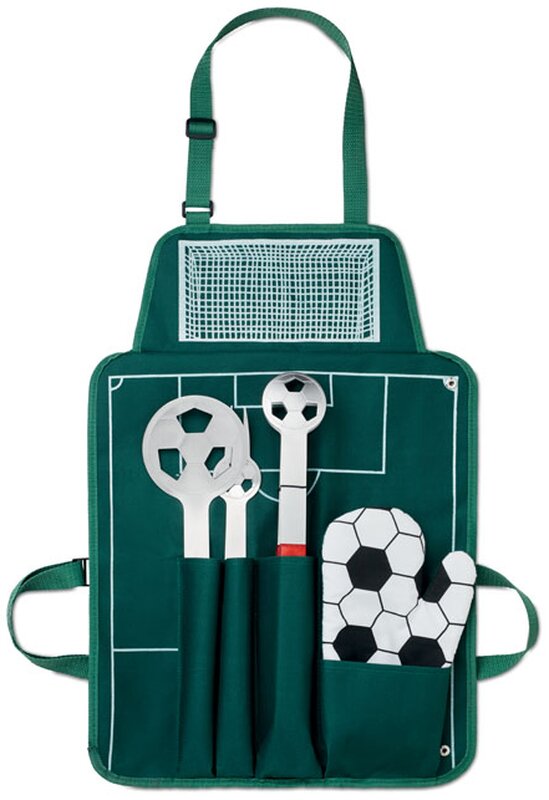 Grilovací zástěra s třemi různými nářadími. Zástěra ze 600D polyesteru.