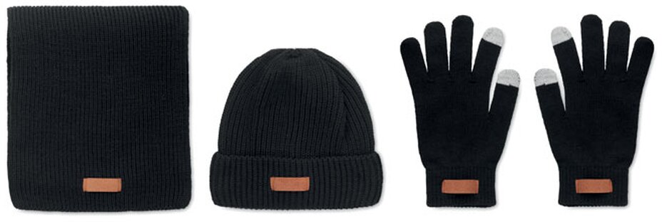 Sada 3 kusů zimních doplňků. Obsahuje čepici, šálu a rukavice se štítkem pro potisk.