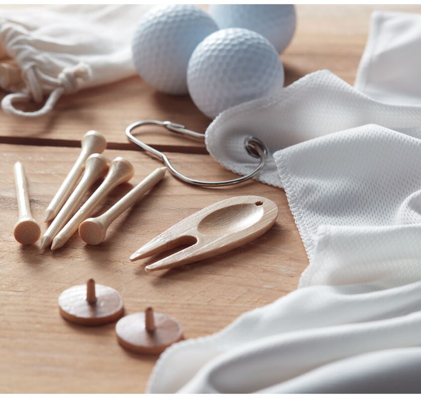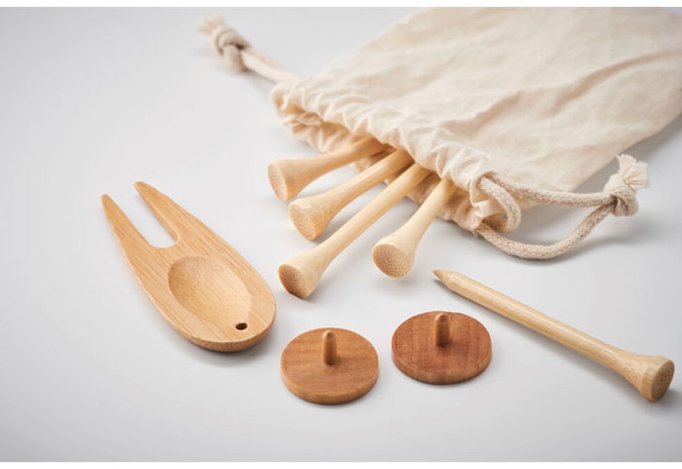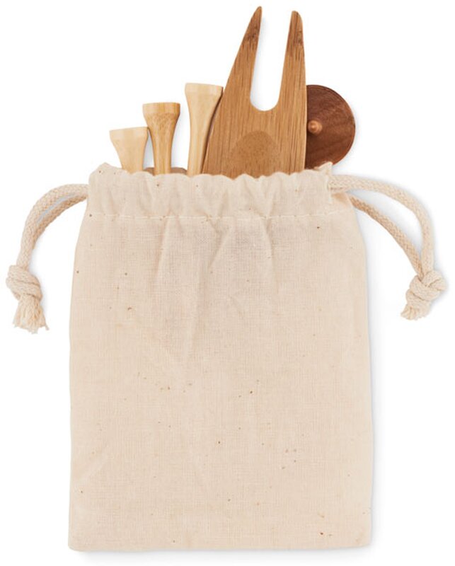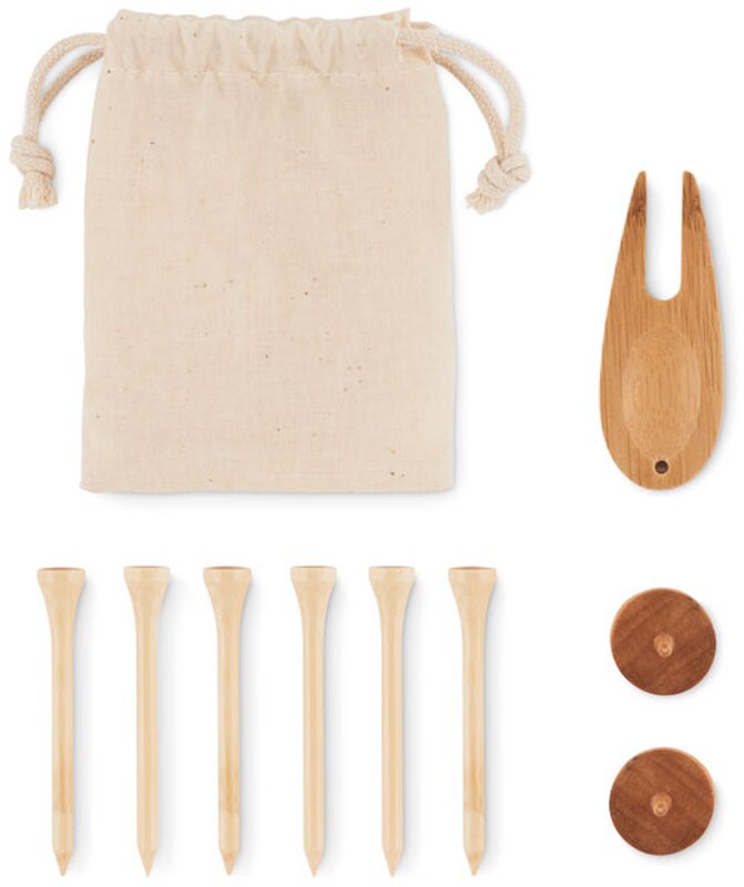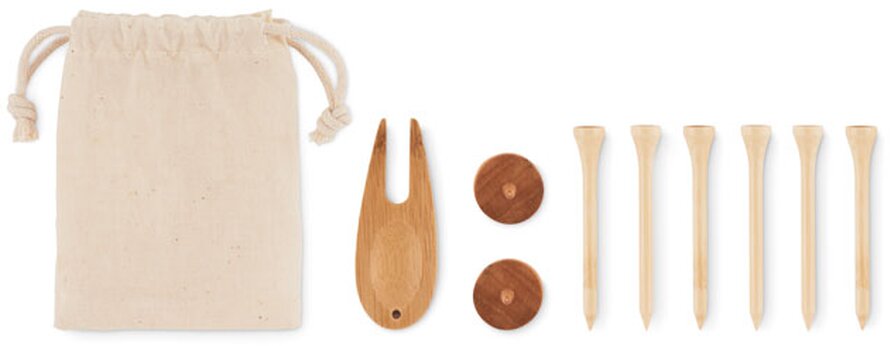 Sada na golf v sáčku z organické bavlny. Obsahuje 6 bambusových týček, 1 bambusové vypichovátko a 2 dřevěné markovátka (značkovače).