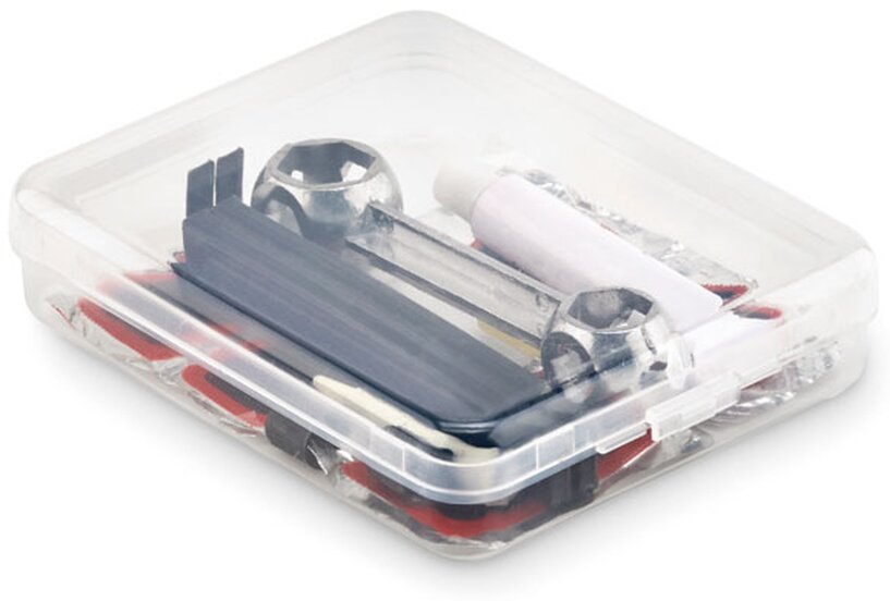 Sada na opravu kola obsahuje klíč a sadu na opravu pneumatiky (lepidlo, víčky ventilků, ventilky , brusný papír, 5x záplatu). Dodáváno v průhledné krabičce.