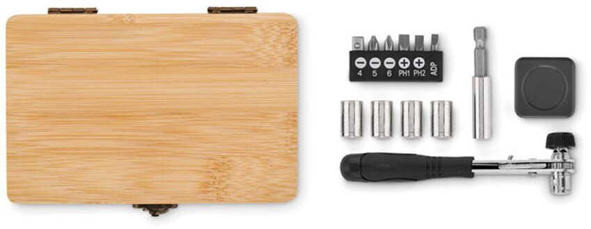 Třináctidílná sada nářadí v bambusovém kufříku obsahující 6 bitů v držáku: 3 velikosti (4, 5, 6 mm), 2 velikosti Philips (PH1, PH2) a 1 adaptér, 4 nástrčné hlavice (7 mm, 8 mm, 9 mm, 10 mm), adaptér a měřicí pásmo.
