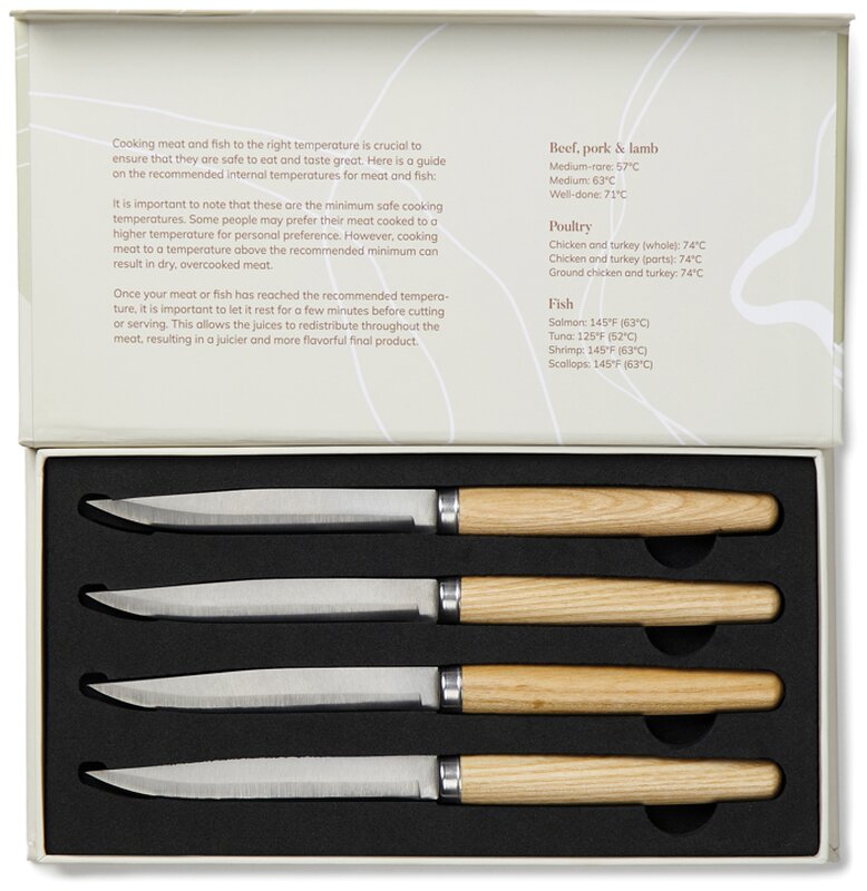 Sada čtyř nožů v typickém skandinávském stylu, která potěší každého milovníka designu i dobrého jídla. Čepel z vysoce kvalitní nerezové oceli zaručuje dlouhou životnost a skvělý výkon při krájení masa. Ergonomická rukojeť z jasanového dřeva dodává nožům nejen přírodní vzhled, ale i příjemný úchop.