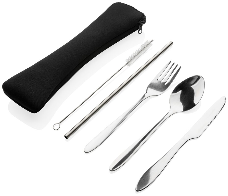 Moderní sada příboru z nerezavějící oceli. Ideální kamkoliv na cesty, do školy či do práce. Sada obsahuje: vidličku, nůž, lžíci, brčko a čistící kartáček na brčko. Vše uloženo v neoprenovém pouzdru na zip a zapínáním pro snadný přenos.