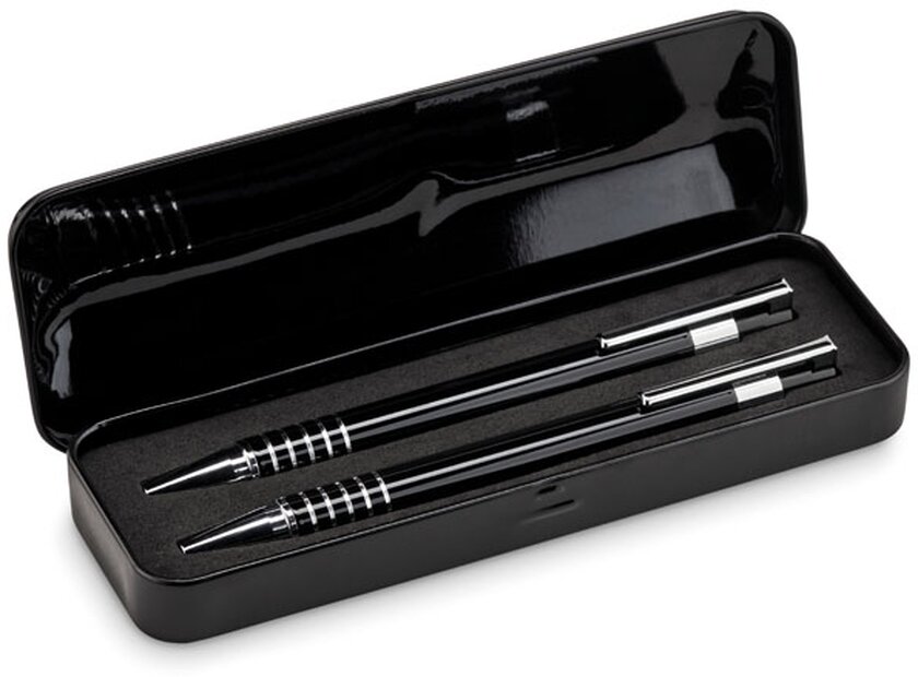 Sada kuličkového pera s modrým inkoustem a mikrotužky z hliníku v kovovém pouzdře.