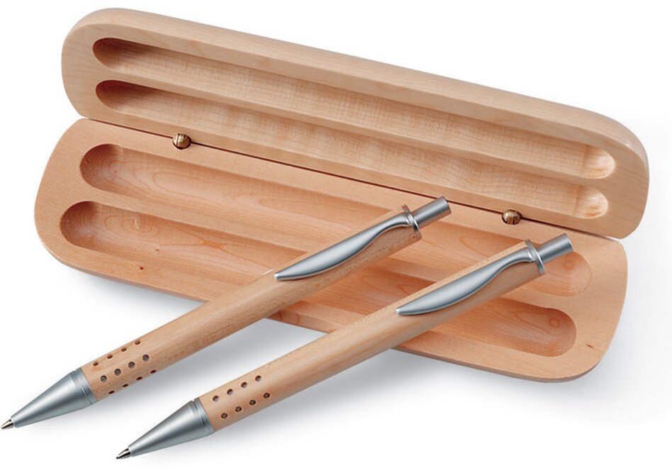 Dárková sada propisky a mechanické tužky v dřevěné krabičce. Náplň pera černá.