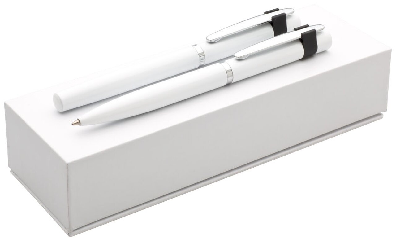 Elegantní dárková sada s propiskou a rollerem v bílé krabičce se značkou GABRIELIS. Tužky mají otočný mechanismus, roller odnímatelné víčko. Povrch tužek je lesklý se stříbrným klipem v černém úchytu.