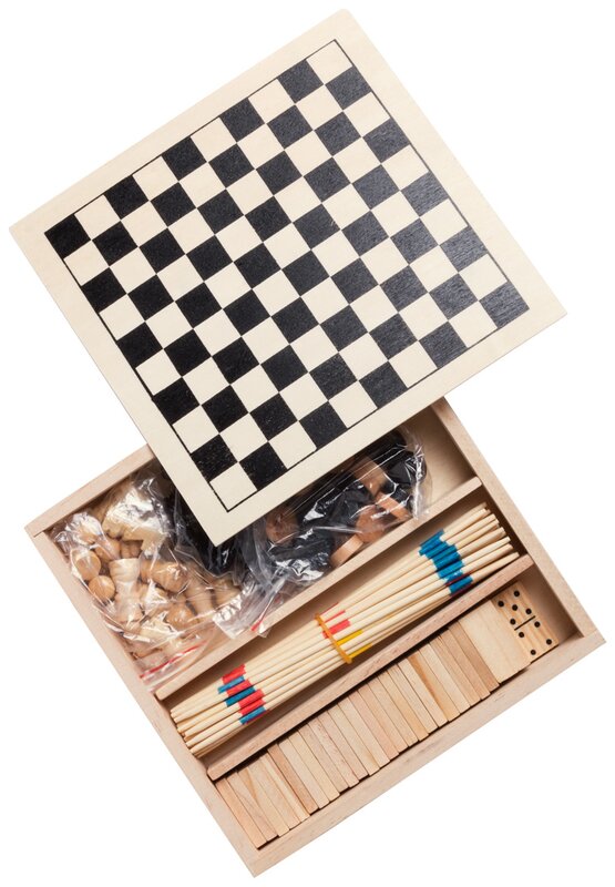 Sada her v dřevěné krabičce. Box obsahuje 4 různé stolní hry - šachy, domino, mikádo a dáma.