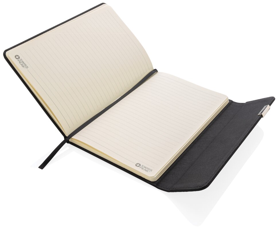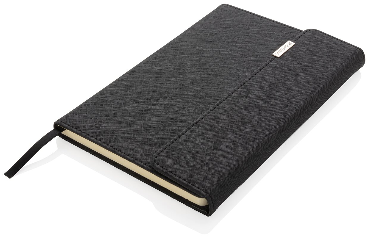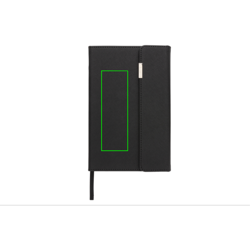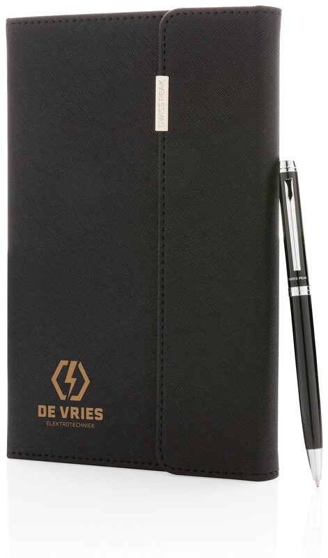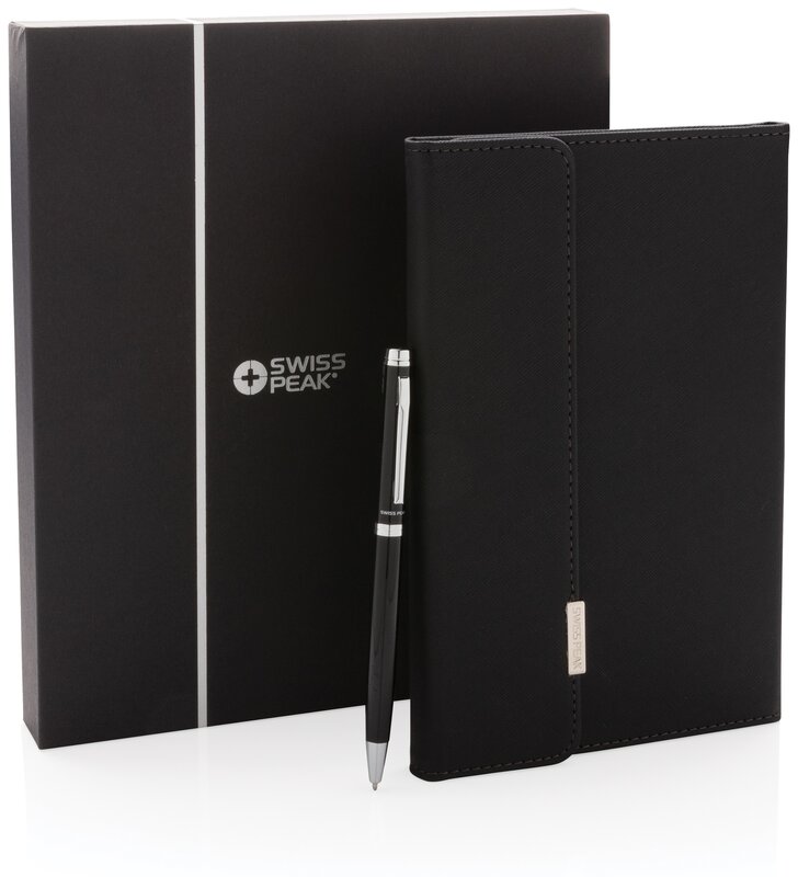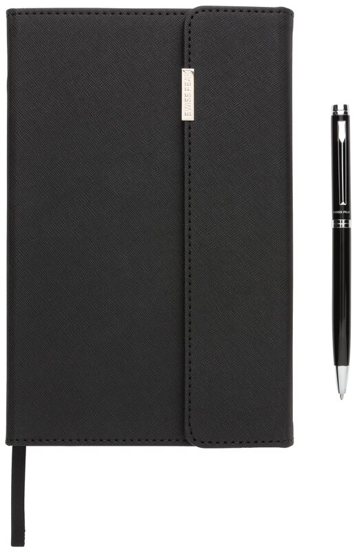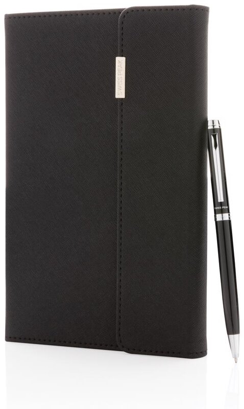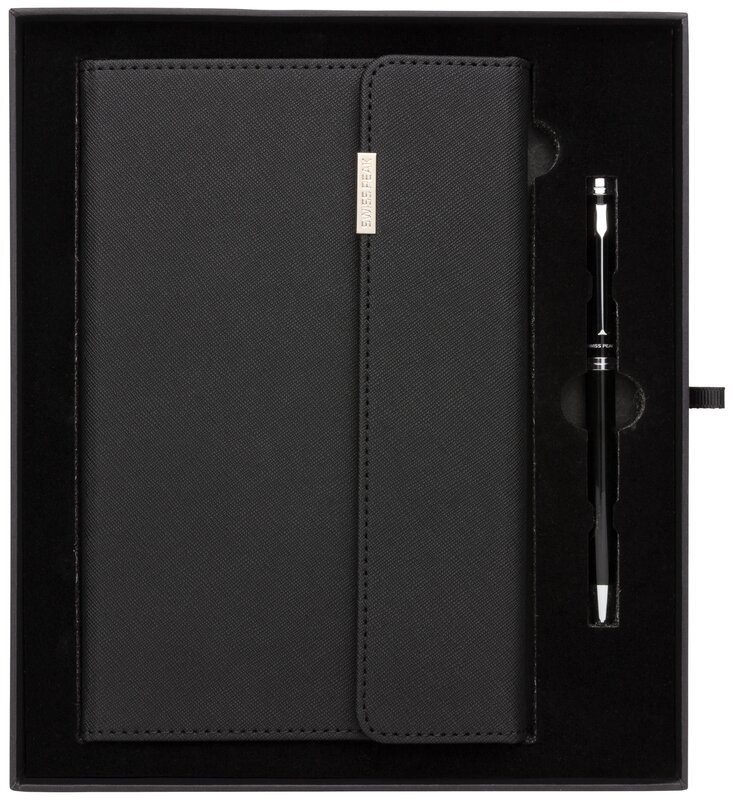 Prémiový set pera v černém uhlazeném designu a poznámkového bloku A5. Poznámkový blok se vzorovaným obalem z PU a kovovým logem obsahuje 80 listů/160 stran krémového linkovaného papíru o gramáži 80g/m2. Pero obsahuje německý inkoust pro psaní až 1 200m textu. Zabaleno v luxusní dárkové krabičce.