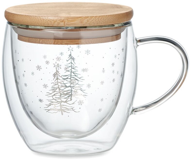 Dvojstěnný hrnek SIAN s designem vánočního stromku. Bambusové víčko se silikonem zabraňuje vylití nápoje. Materiál: borosilikátového sklo. Dvojitá stěna vás ochrání před pálením od horkého nápoje. Objem: 220 ml.