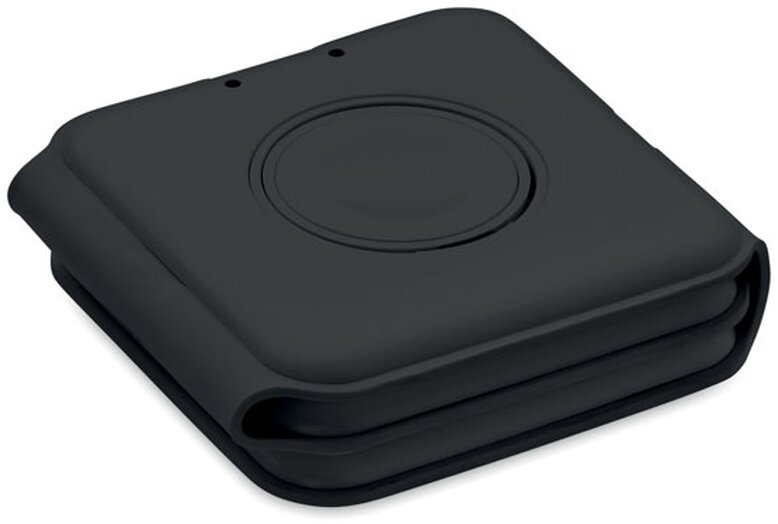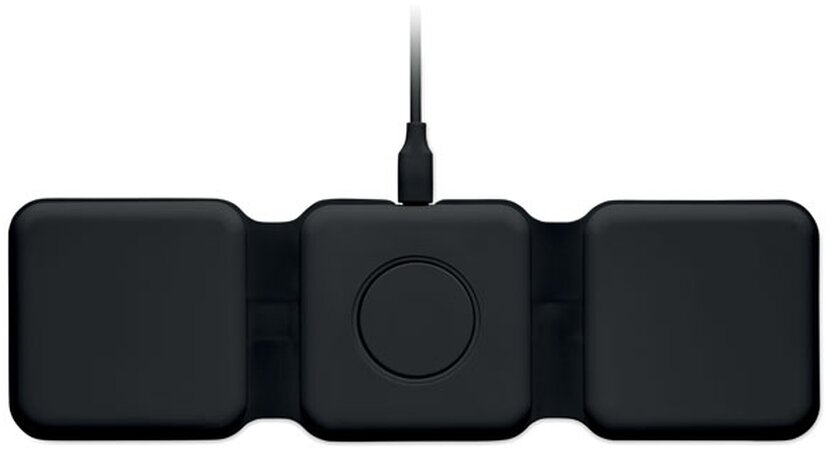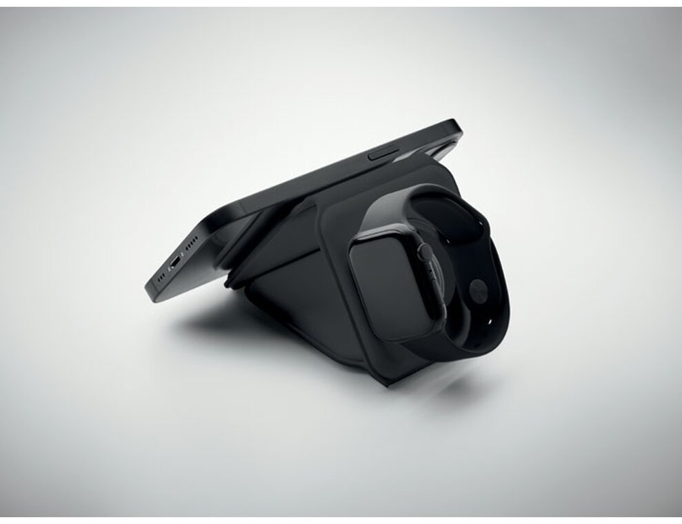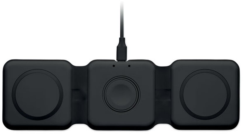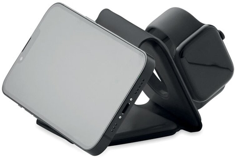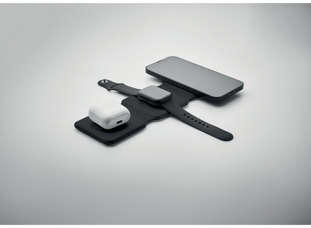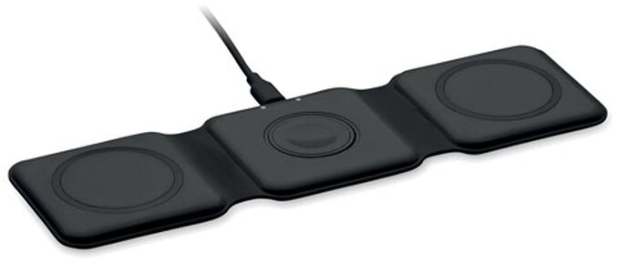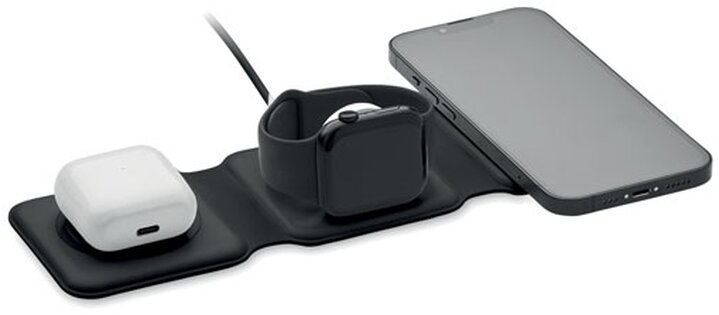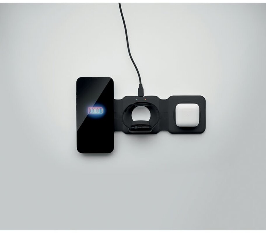 Skládací nabíjecí stanice 3v1 z ABS. 3 nabíjecí plochy. Vstup: 2v1 typ C a typ A. Kompatibilní se všemi zařízeními s podporou QI, jako jsou nejnovější Androidy, iPhone® 8, X a novější. Kompatibilní také s hodinkami iWatch.