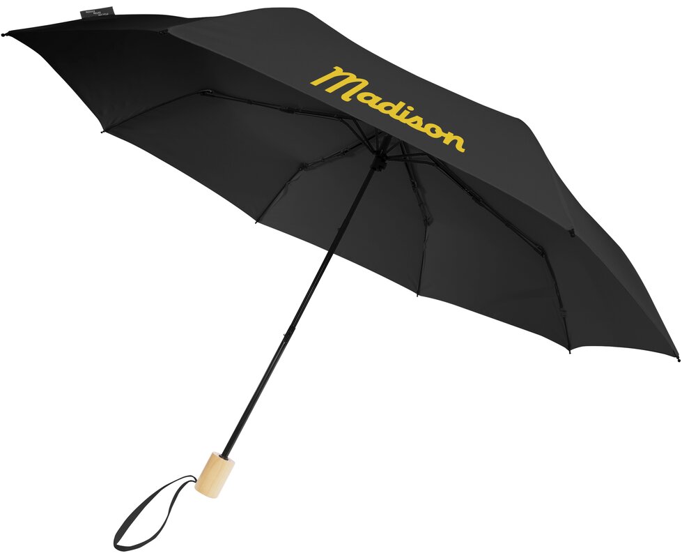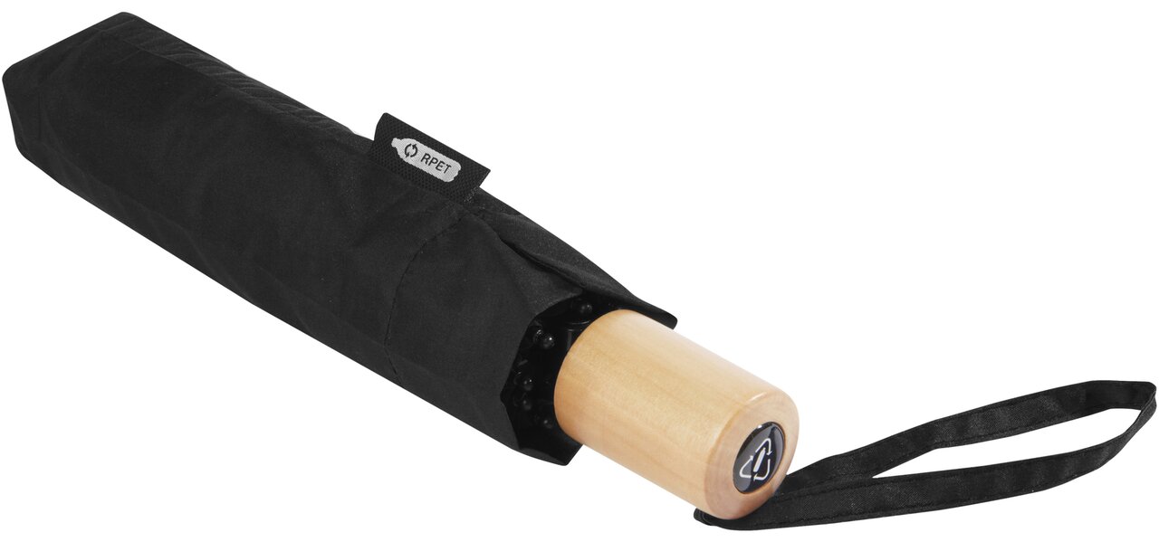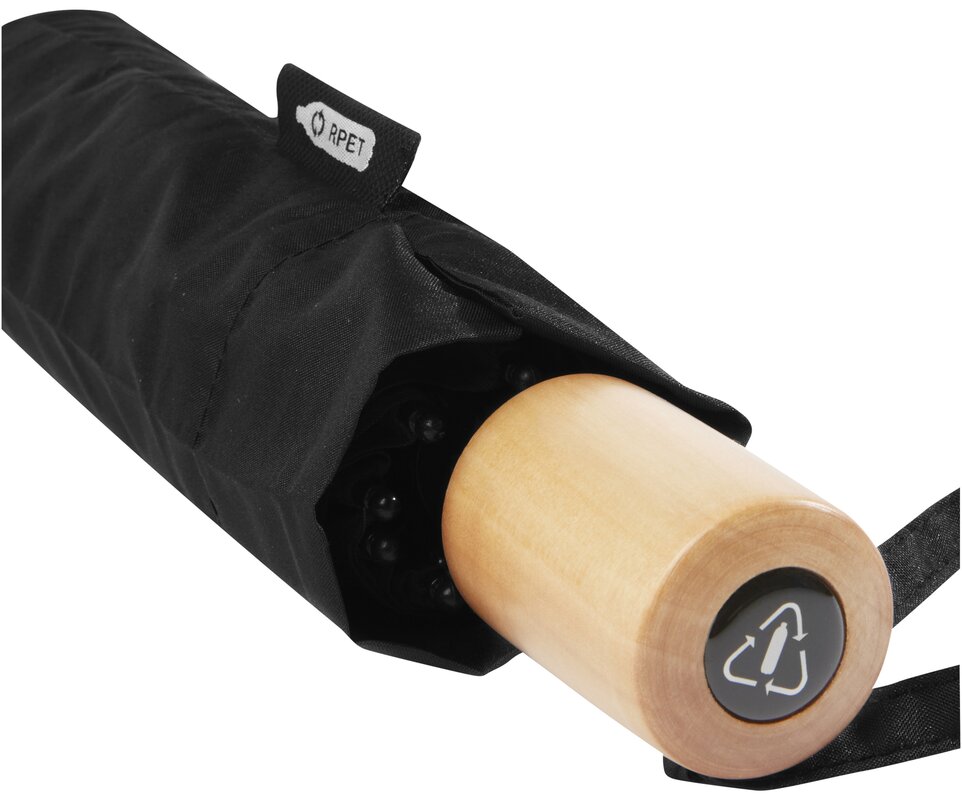 Deštník s manuálním otevíráním s kupolí z recyklovaného PET polyesteru ponžé. Odolná kovová tyč a vysoce kvalitní rám s laminátovými žebry nabízí maximální flexibilitu ve větrných podmínkách. Dodává se v sáčku a lze jej snadno umístit do tašky nebo batohu pro pohodlné nošení. Společně s dřevěnou rukojetí a kupolí z recyklovaného PET polyesteru ponžé nabízí udržitelnou volbu. Dostupný v široké řadě moderních barev s velkou plochou pro potisk na každém panelu.