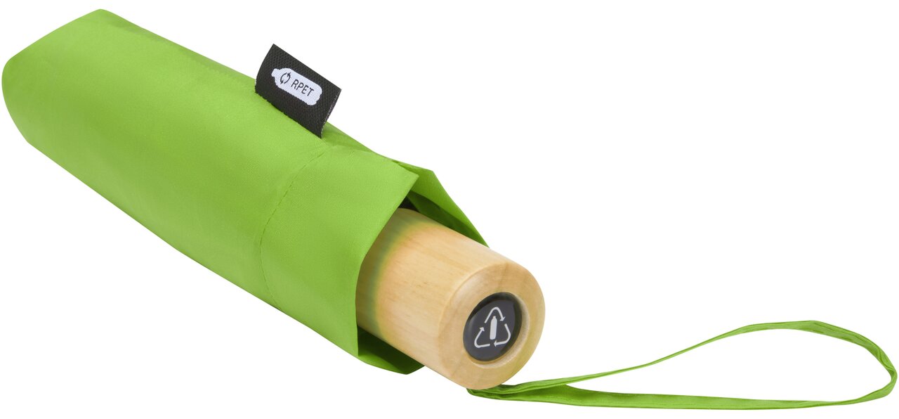 Deštník s manuálním otevíráním s kupolí z recyklovaného PET polyesteru ponžé. Odolná kovová tyč a vysoce kvalitní rám s laminátovými žebry nabízí maximální flexibilitu ve větrných podmínkách. Dodává se v sáčku a lze jej snadno umístit do tašky nebo batohu pro pohodlné nošení. Společně s dřevěnou rukojetí a kupolí z recyklovaného PET polyesteru ponžé nabízí udržitelnou volbu. Dostupný v široké řadě moderních barev s velkou plochou pro potisk na každém panelu.