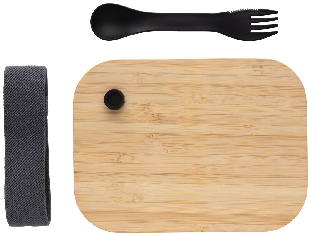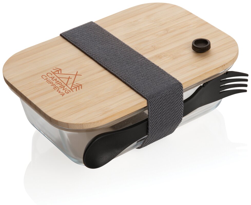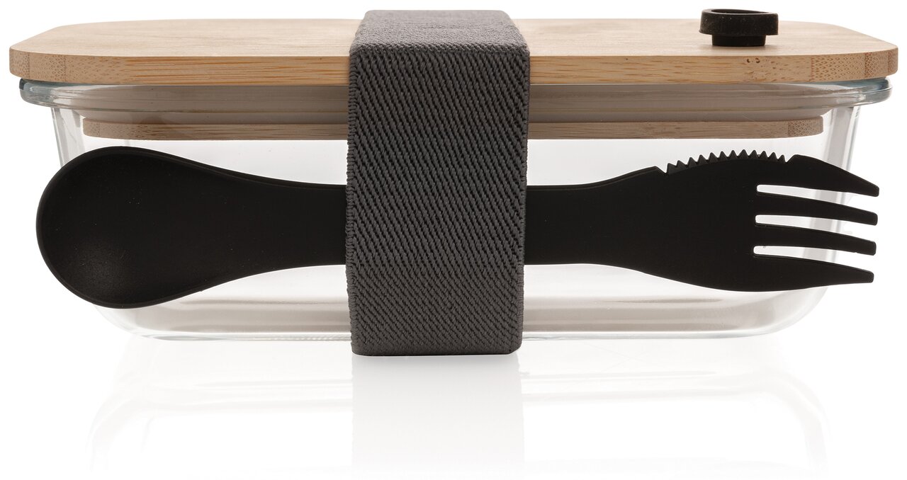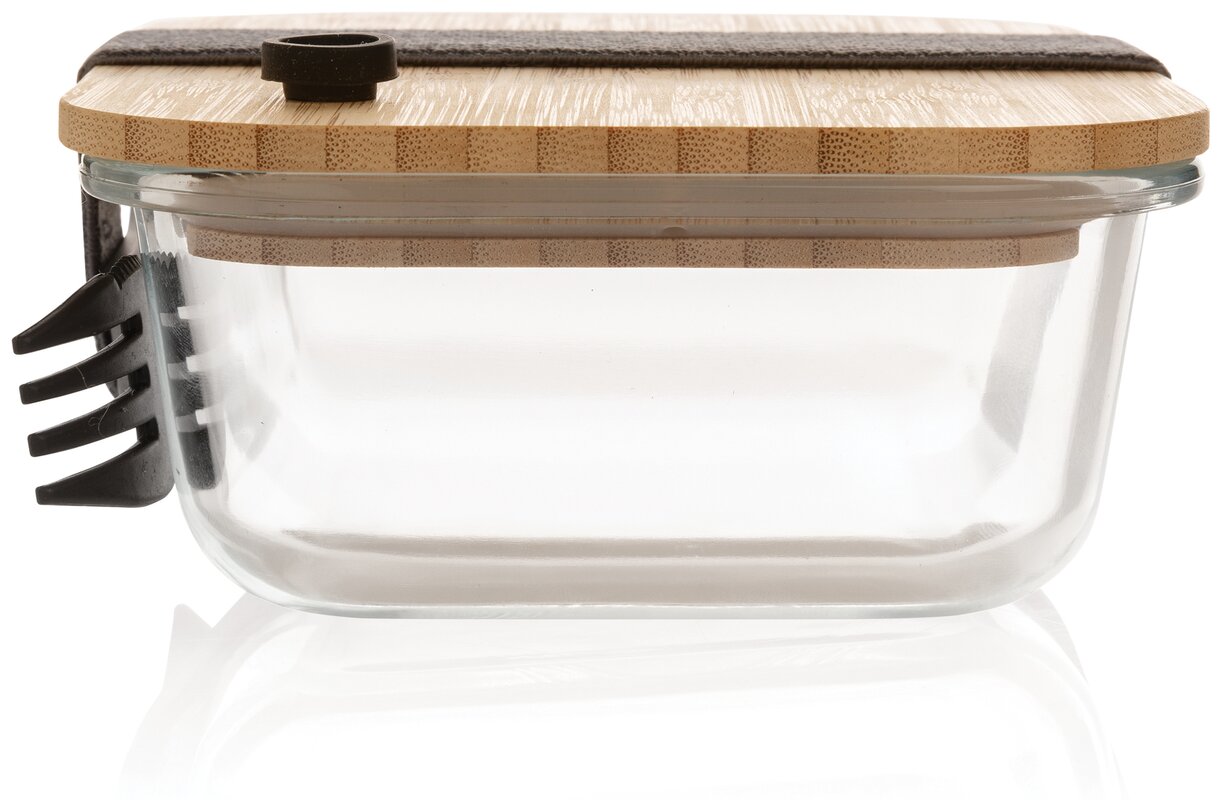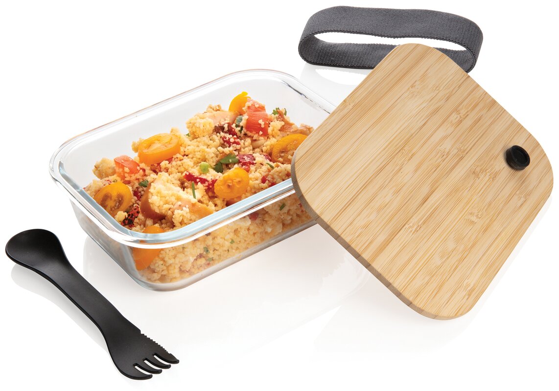 Skleněná krabička pro snadné uchování a ohřev pokrmů. Vzduchotěsné víko vyrobené z bambusu. Tělo krabičky vyrobeno z borosilikátového skla odolného tepelným šokům. Součástí balení je prakticka lžička/vidlička 2 v 1.