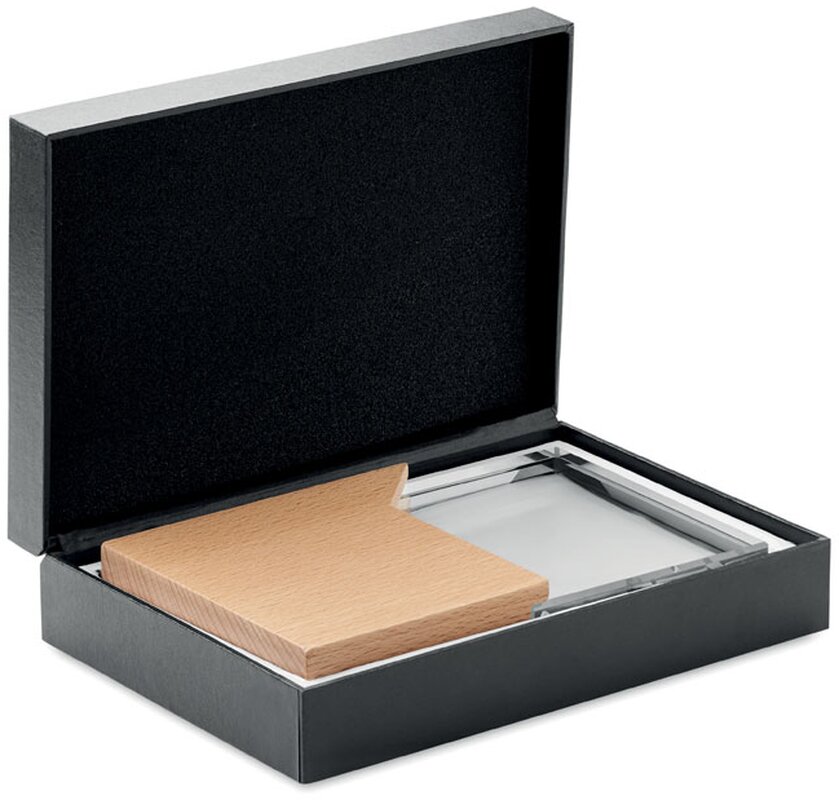 Skleněná trofej nebo pamětní plaketa na podstavci, který je vyroben z bukového dřeva. Ideální na předání za jakýkoliv úspěch. Produkt se dodává v dárkové krabičce.