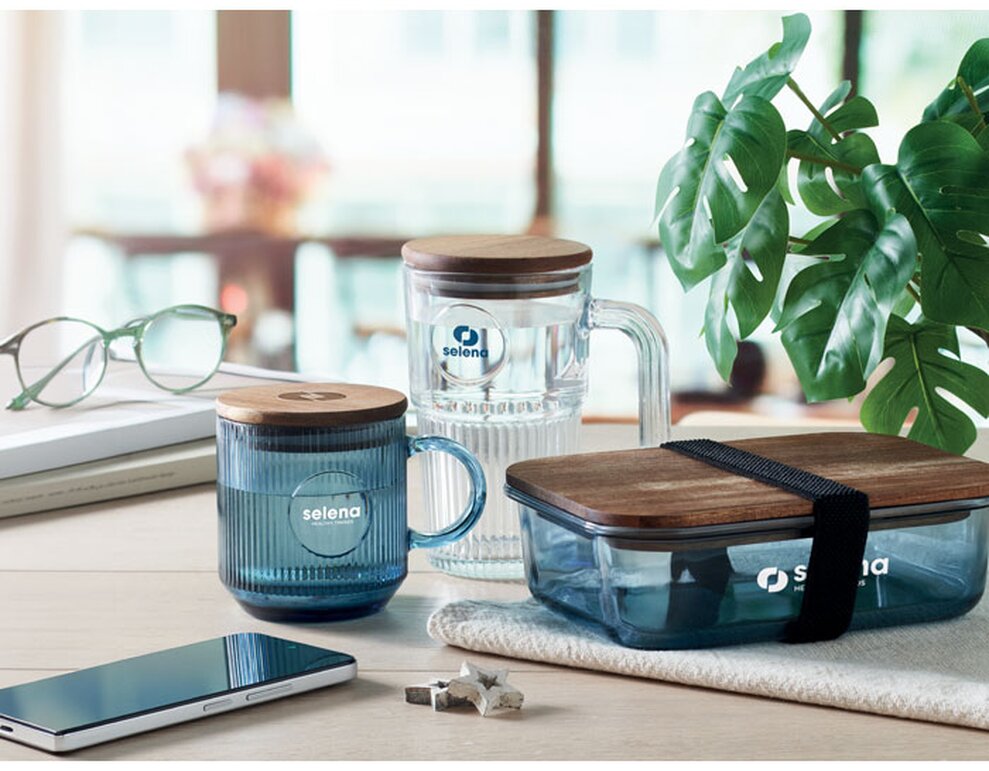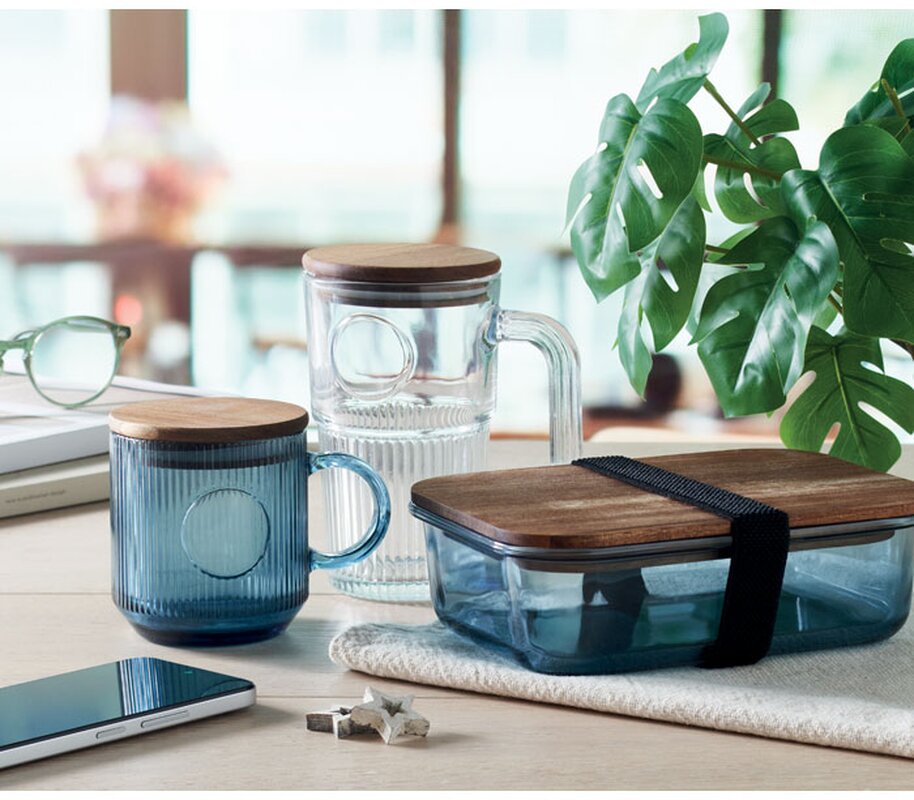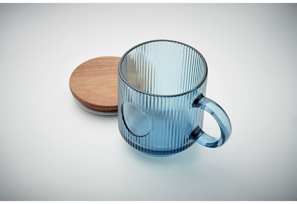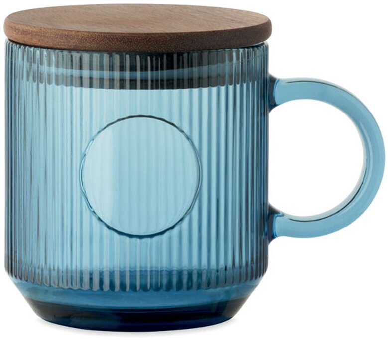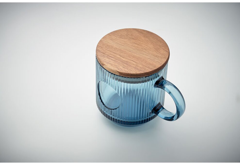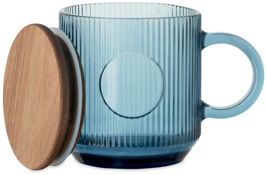 Žebrovaný skleněný hrnek s akáciovým víčkem. Objem 300 ml. FSC®-certified | FSC 100%, W16.3, FSC-C213206