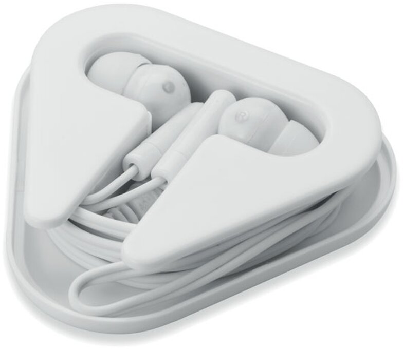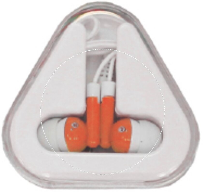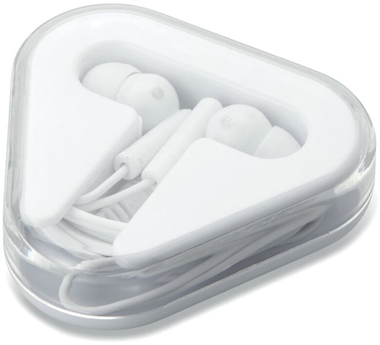 Sluchátka z PVC v trojúhelníkovém balení. Délka kabelu 120 cm.