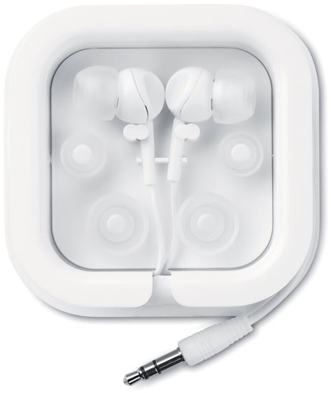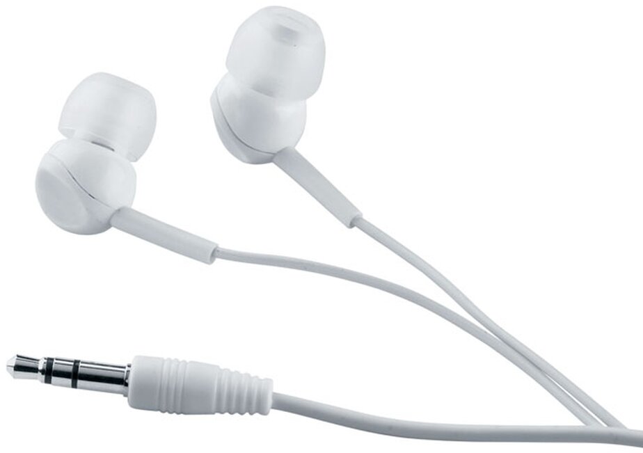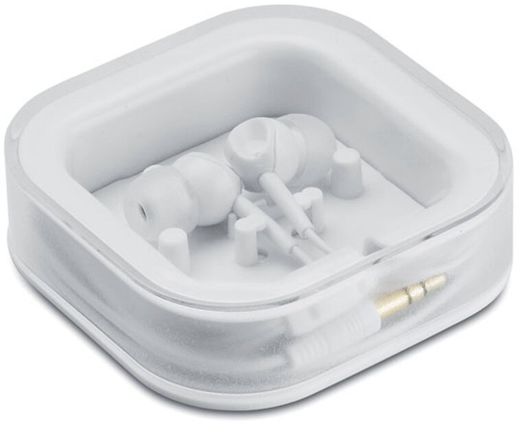 Sluchátka do uší se silikonovými špunty v plastové krabičce a 120 cm dlouhým kabelem.