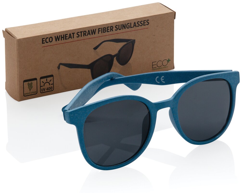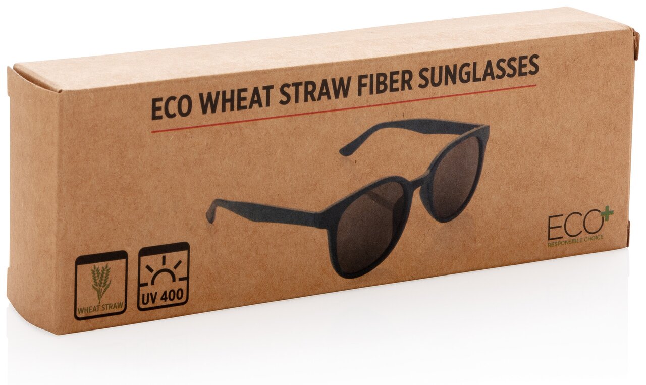 Sluneční brýle s obroučkami a nožičkami vyrobenými z lisované pšeničné slámy. Zabaleno v krabičce z kraftového papíru. Ochrana UV 400.