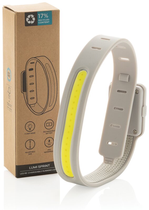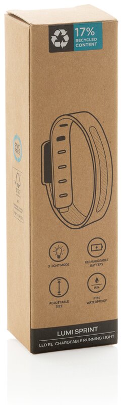 Sportovní dobíjecí LED svítilna Lumi Sprint z recyklovaného ABS plastu s RCS certifikací, ideální pro firemní potisk. Navržená pro bezpečné noční běhy, snadno se připevní na paži a pevně drží na místě díky nízké hmotnosti 39,6g. Silné 90lumenové COB LED světlo nabízí tři režimy (bílé světlo, červené světlo, blikající bílo-červené) pro vynikající viditelnost. Voděodolná IPX4. Dobíjecí baterie 400 mAh poskytuje až 2 hodiny provozu, plné nabití za 1,25 hodiny přes USB-C kabel z recyklovaného TPE.