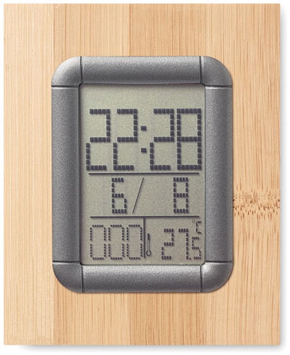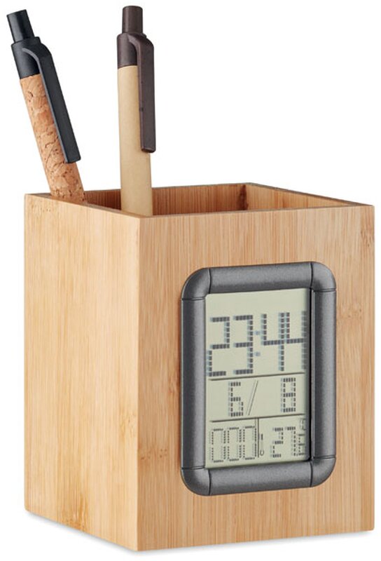 Bambusový stojan na tužky s vestavěným LCD kalendářem, budíkem a teploměrem. Produkt obsahuje 2 baterie.