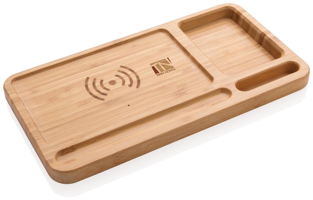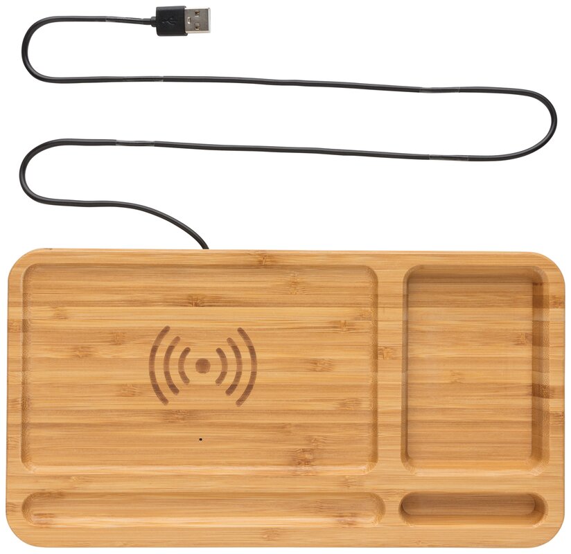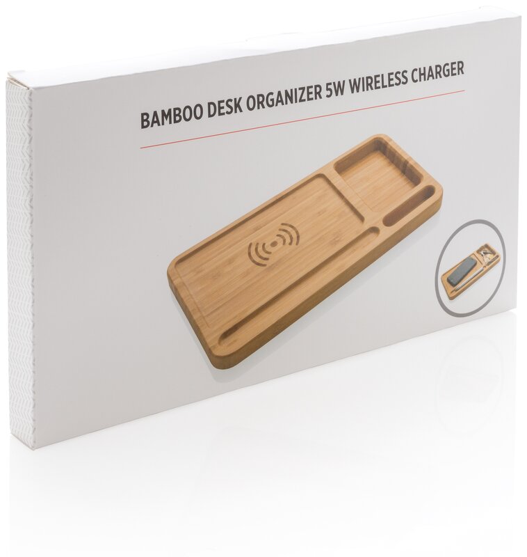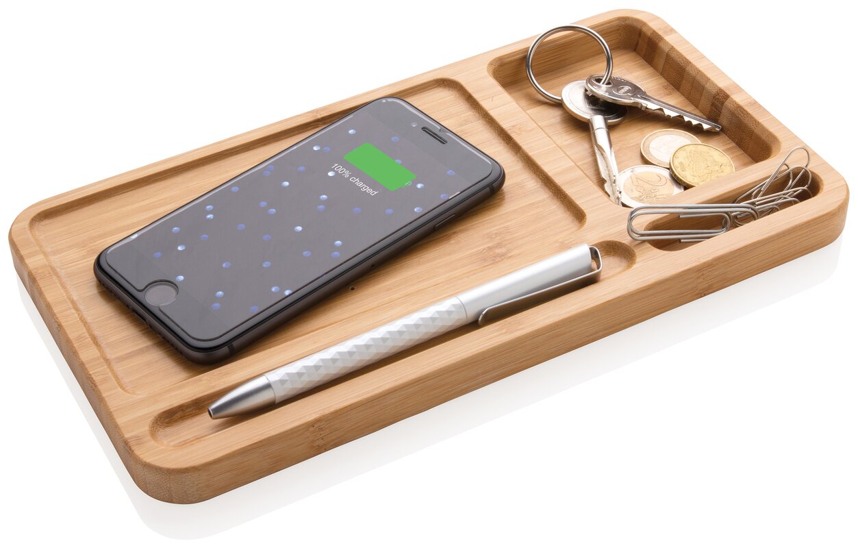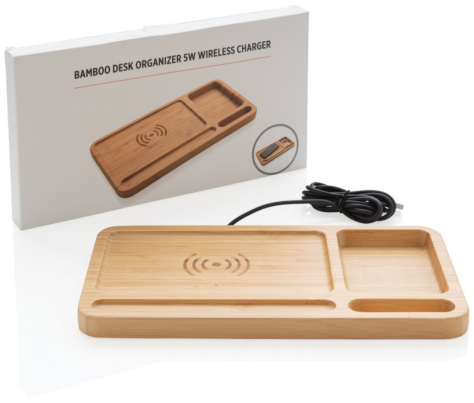 Super doplněk na váš pracovní stůl. Stolní organizér z ekologického bambusu vám umožní udržet stůl stále čistý a přehledný. Díky zabudovanému nabíjení pak můžete nabíjet pouhým položením telefonu bez použití kabelů. Vstup 5V/1.5A, bezdrátový výstup: 5V/800mA 5W. Včetně 1,5m dlouhého micro USB kabelu.