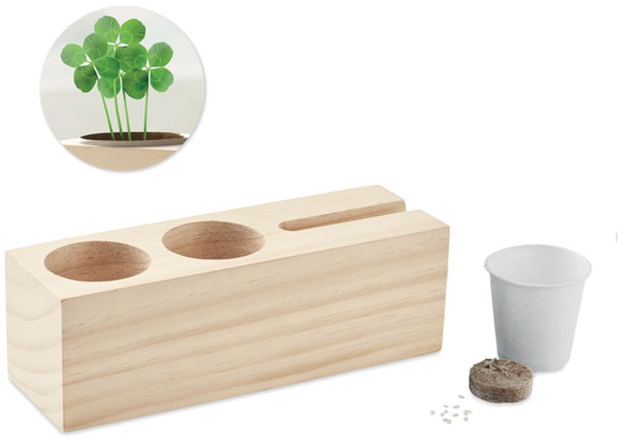 Dřevěný stolní držák psacích potřeb a telefonu, jehož součástí jsou také semínka jetele. Vneste do své kanceláře nebo domova trochu života a zeleně s touto zábavnou dekorací na pracovní stůl nebo stůl doma. Zasaďte semínka a čtyřlístky vyrostou. Možná vás překvapí nějaký čtyřlístek pro štěstí? Bambus je přírodní materiál, u každého jednotlivého kusu se mohou vyskytnout drobné odchylky v barvě a velikosti, které mohou mít vliv na finální podobu potisku. Včetně tablety s půdou.Včetně tablety s půdou. FSC®-certified | FSC 100%, W13.2, FSC-C213206