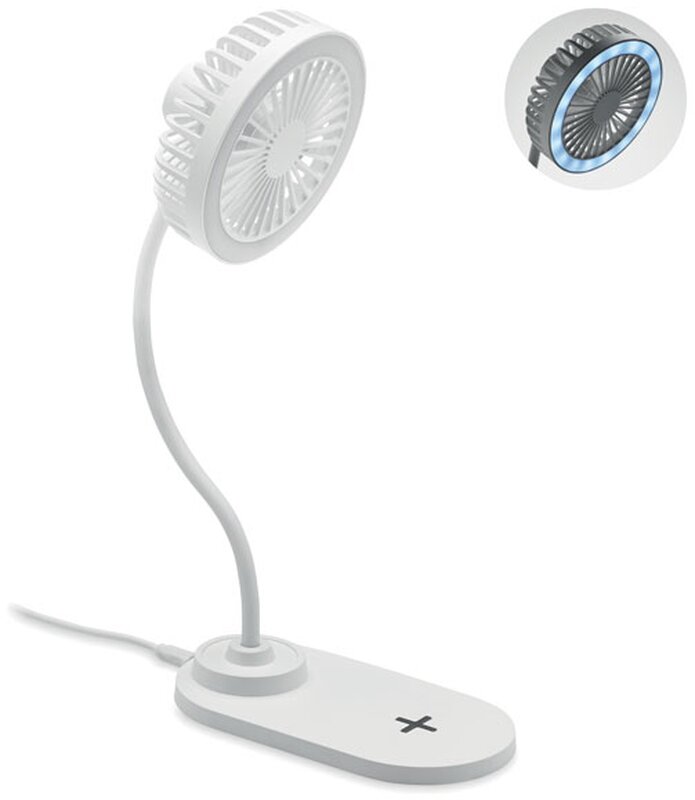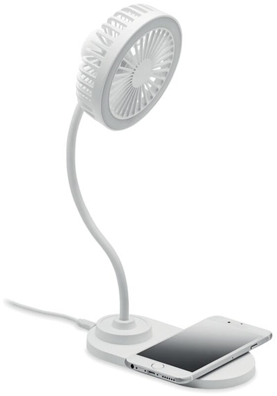 Stolní ventilátor, který obsahuje 3 nastavené rychlosti a 10W bezdrátovou nabíječku. Výstupní výkon: DC 9V/1,1A (10W) pro rychlé nabíjení. Produkt je kompatibilní s nejnovějšími telefony Android, iPhone® 8 a novějšími. Výrobek je z ABS.