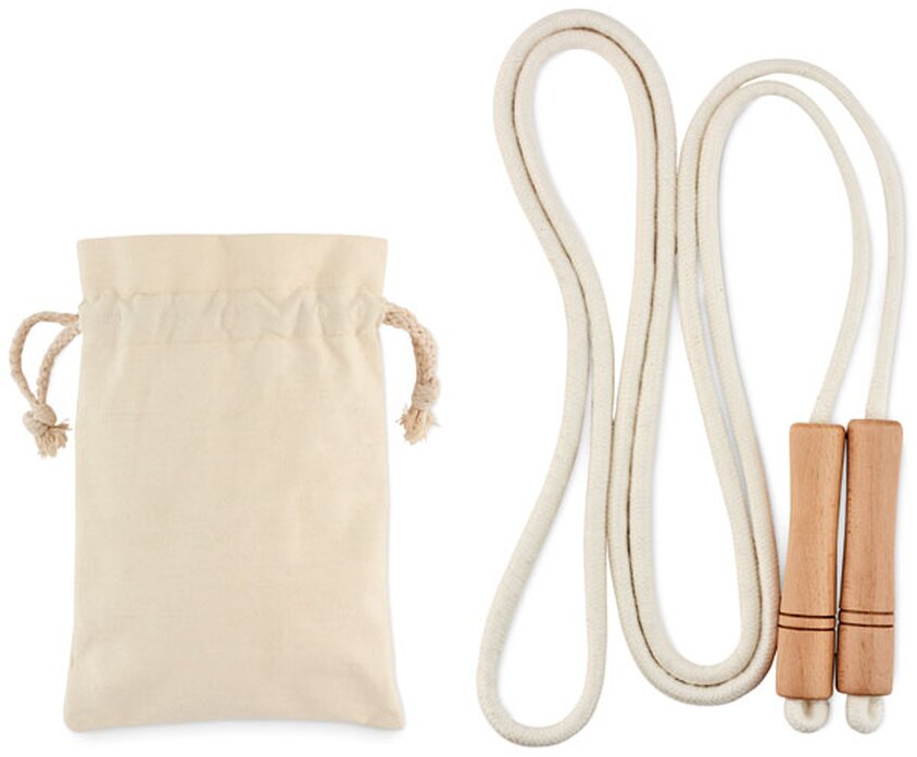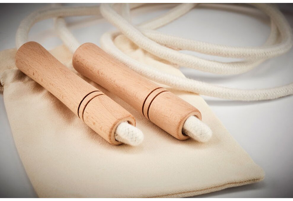 Bavlněné švihadlo JUMP s dřevěnými držadly. Je dodávané v bavlněném stahovacím sáčku pro snadné přenášení.