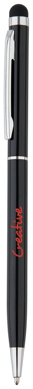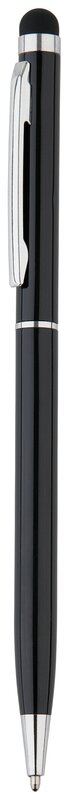 Tenké kuličkové pero se stylusem a jednoduchým šroubovacím mechanismem. Produkt je vyroben z nerezové oceli.