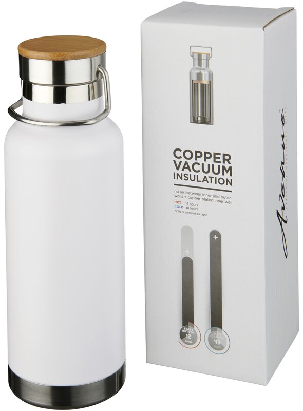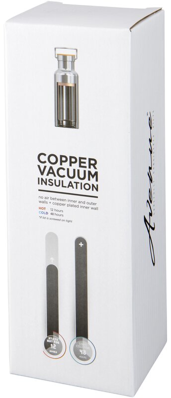 Měděná sportovní lahev má vakuovanou izolaci a je z nerezové oceli. Konstrukce neobsahuje plasty, má dvojitou stěnu, díky které zůstanou nápoje chladné po dobu 48 hodin nebo horké po dobu nejméně 12 hodin. Díky této konstrukci také na vnějších stěnách nekondenzuje vlhkost. Uzávěr je šroubovací s dřevěnými detaily a povrch je práškově lakovaný pro trendy vzhled. Lahev dodáváme v krabičce.