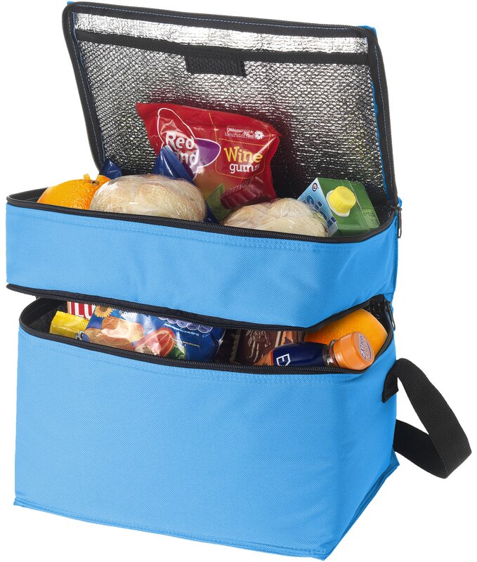Chladicí taška s dvěma samostatnými oddíly na zip a s nastavitelným ramenním popruhem. Příslušenství není součástí. Polyester 600D.