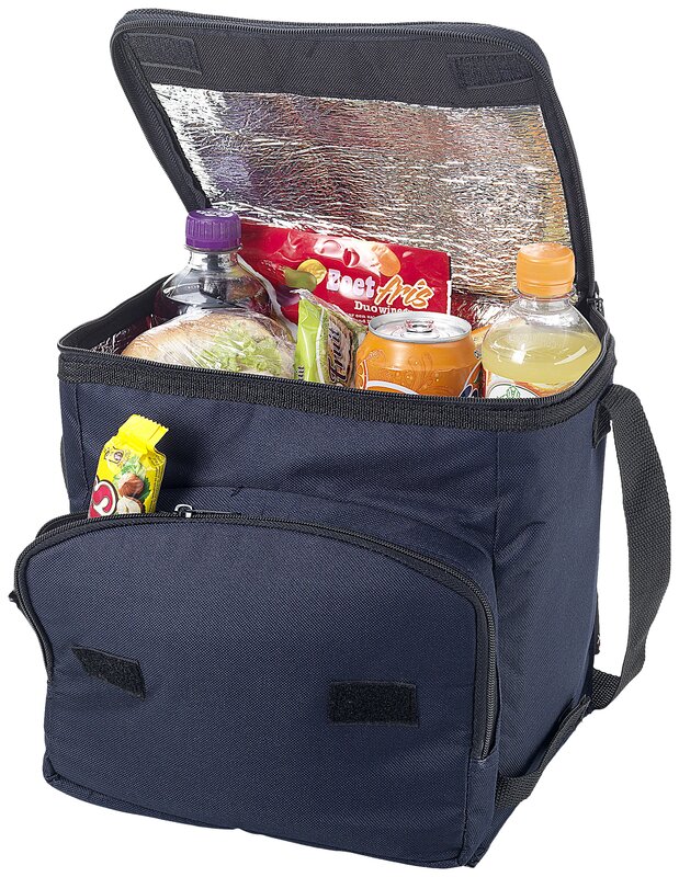 Chladicí skládací taška s otevřeným hlavním prostorem na zip a přední kapsičkou na zip. Nastavitelný ramenní popruh. Termotašku lze úhledně složit díky suchému zipu na přední kapse. Polyester 600D.