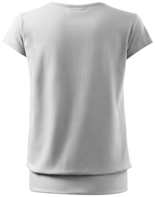 Trendové dámské triko s velmi krátkým rukávem, volnějšího střihu, v dolním kraji všité do širokého lemu. Kulatý průkrčník s úzkým lemem ze shodného materiálu. Ramena zpevněna všitým proužkem. Triko sahá do hloubky boků. Silikonová úprava zajišťuje měkký a splývavý omak.