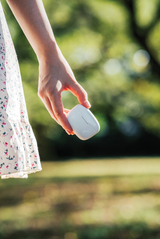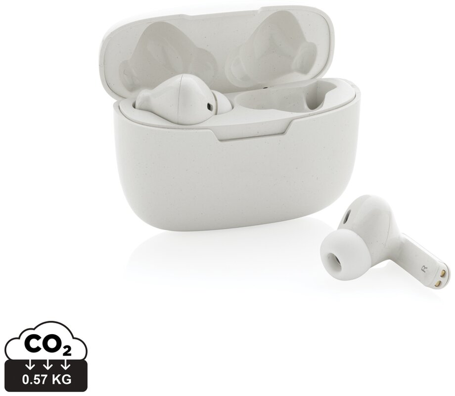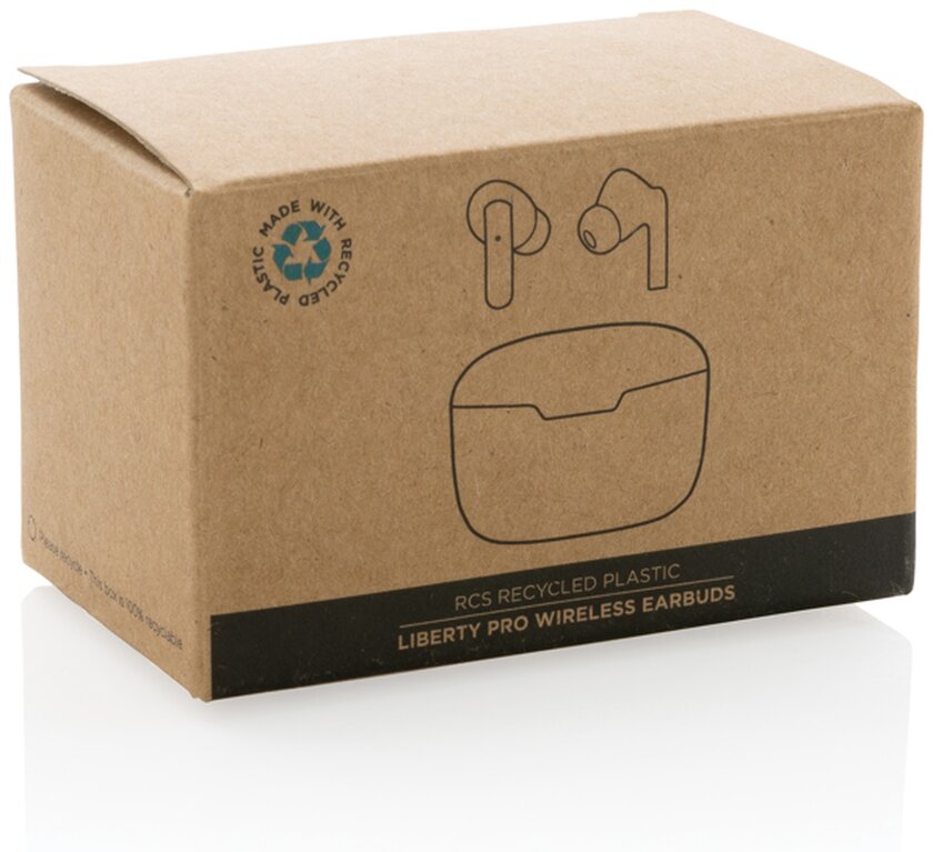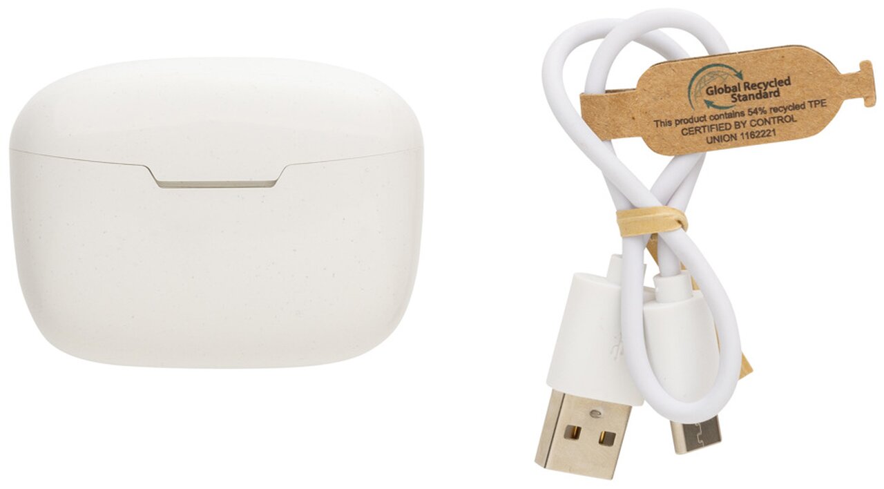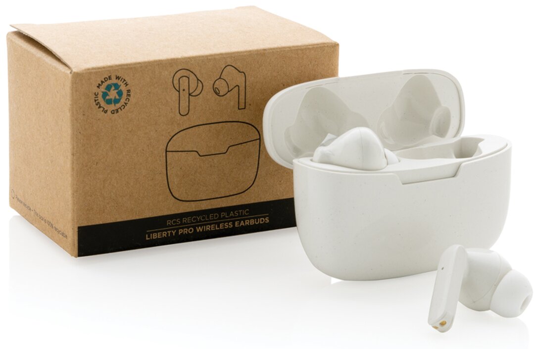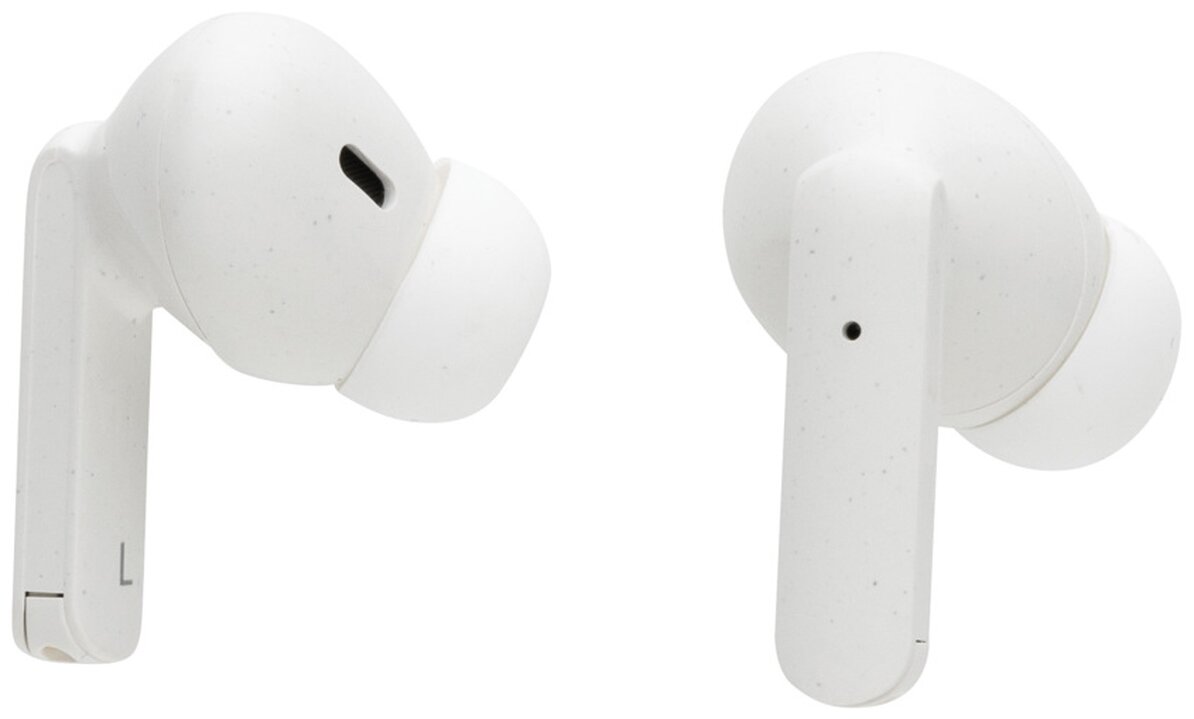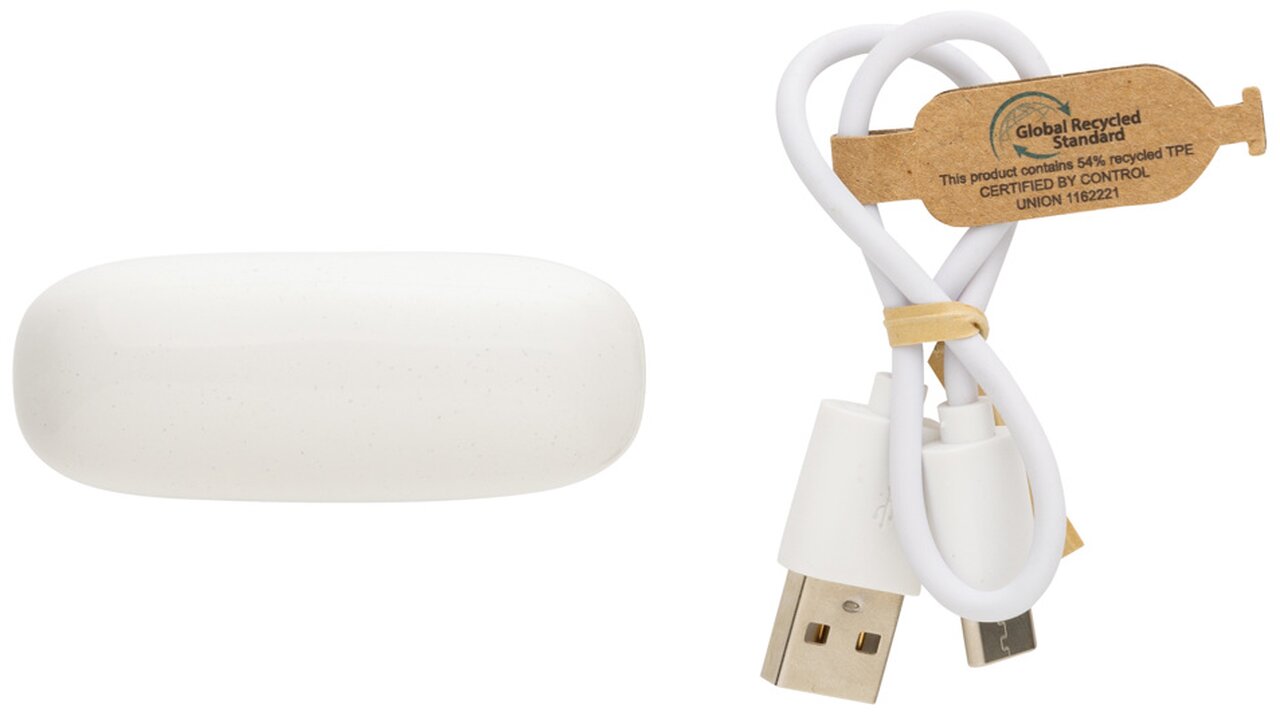 Další generace pohodlných bezdrátových sluchátek v nabíjecí krabičce. Výrobek obsahuje kapacitu 35 mAh pro poslech po dobu až 3h na střední hlasitost, nabíjecí krabičku s kapacitou 300 mAh, která sluchátka plně dobije již za 1,5h, BT 5.3 zajišťující snadné automatické párování a stabilní bezdrátové spojení na vzdálenost až 10m, mikrofon pro možnost telefonování ve stereo režimu, dotykové tlačítko pro příjem hovorů nebo pozastavení hudby, také 3 extra páry nástavců do uší v různých velikostech a nabíjecí kabelu z GRS TPE. Sluchátka jsou vyrobena z RCS recyklovaného ABS plastu. Celkový podíl recyklátu dle váhy produktu: 56 %. Produkt se dodává zabalen v FSC® kraftové dárkové krabičce