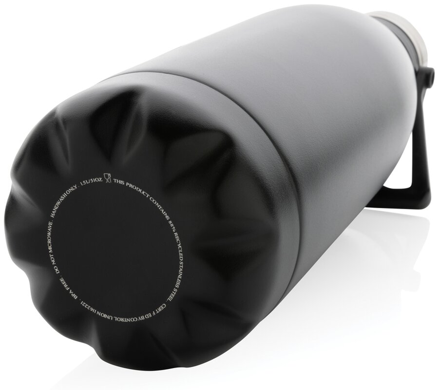 Velká termoláhev o objemu 1,5 litru vyrobena z RCS recyklované nerezavějící oceli. RCS (Recycled Claim Standard) je globální standard, umožňující ověřit použití recyklovaného materiálu v produktu napříč celým dodavatelským řetězcem. Celkový podíl recyklátu dle váhy produktu: 88 %. Izolace s dvojitou stěnou napomáhá udržet nápoje horké až 5 hodin a studené až po dobu 15 hodin. Stylové práškové lakování těla lahve, praktické madlo pro dobré nošení. Objem: 1 500 ml. Bez BPA. Baleno v FSC® kraftové dárkové krabičce.
