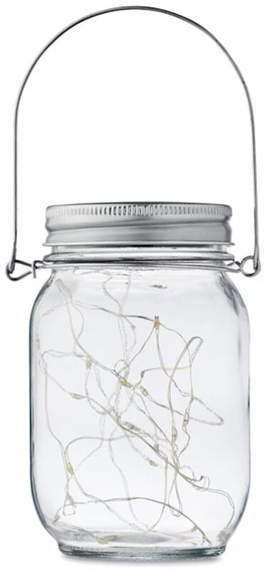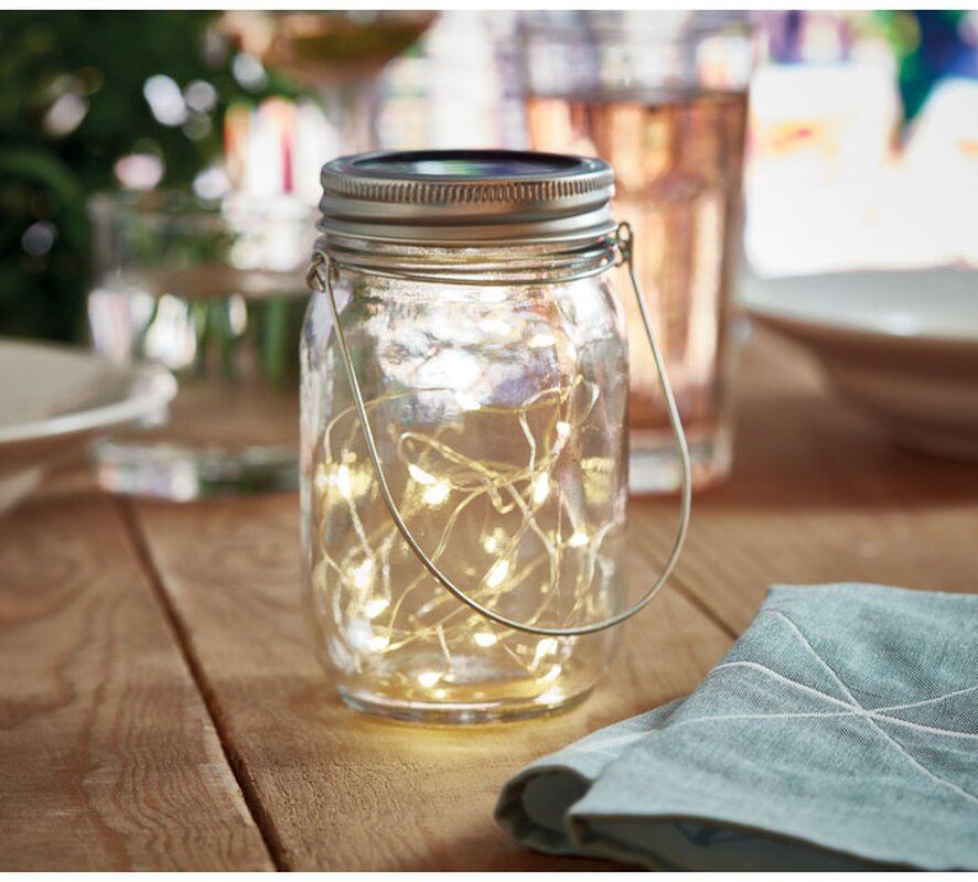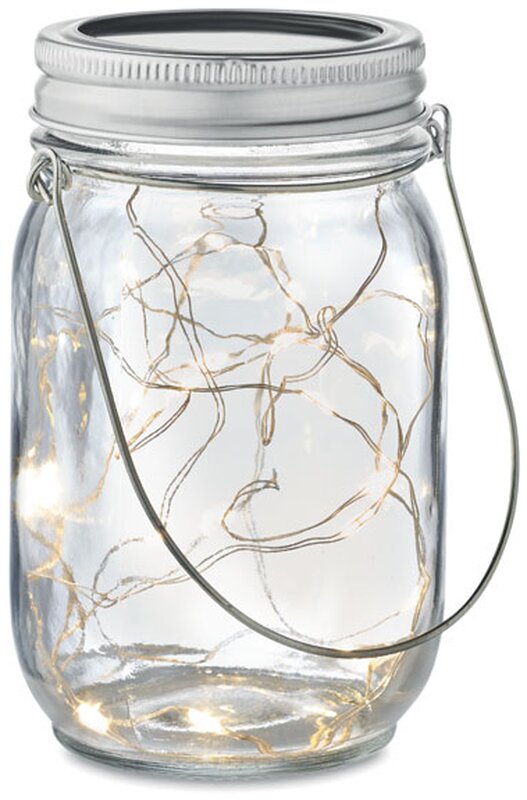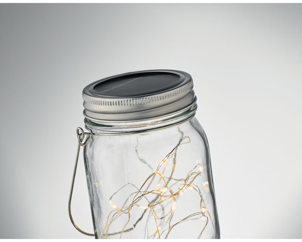 Venkovní solární zavařovací sklenice s 20 LED pohádkovými světelnými řetězy.Vytvořte si příjemnou atmosféru na zahradě umístěním této zavařovací sklenice nastůl nebo venkovní terasu. Malá LED světýlka vytvářejí ve tmě líbivý efekt. Vnitřní baterie se nabije umístěním na slunci nebo na denním světle. Na hornístraně je závěs, takže sklenici můžete přenášet nebo zavěsit. Když je 300mAhbaterie plně nabitá, bude svítit přibližně 5 hodin. NI-MH je součástí balení. Vodotěsnost IP44.
