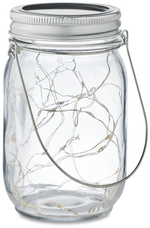 Venkovní solární zavařovací sklenice s 20 LED pohádkovými světelnými řetězy.Vytvořte si příjemnou atmosféru na zahradě umístěním této zavařovací sklenice nastůl nebo venkovní terasu. Malá LED světýlka vytvářejí ve tmě líbivý efekt. Vnitřní baterie se nabije umístěním na slunci nebo na denním světle. Na hornístraně je závěs, takže sklenici můžete přenášet nebo zavěsit. Když je 300mAhbaterie plně nabitá, bude svítit přibližně 5 hodin. NI-MH je součástí balení. Vodotěsnost IP44.